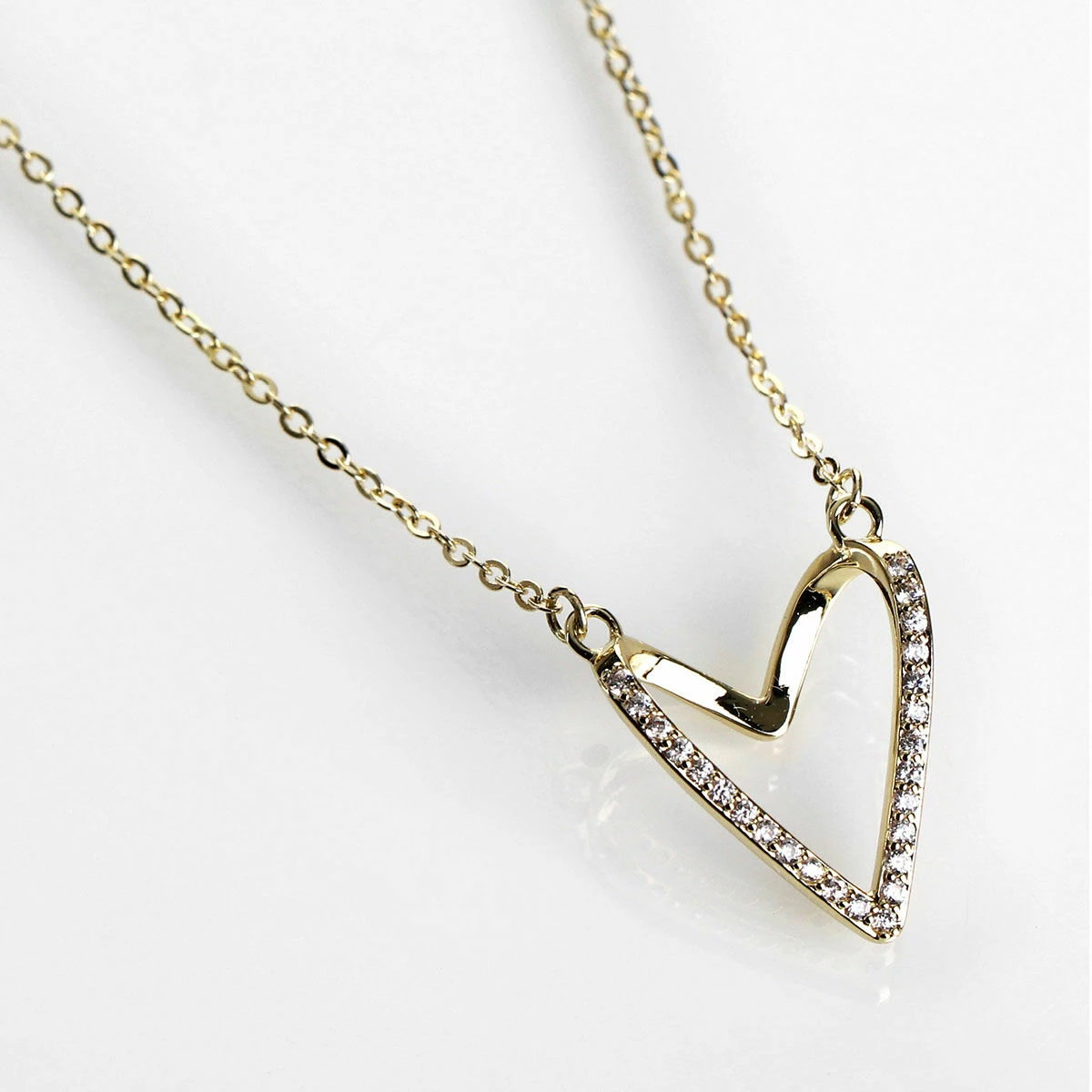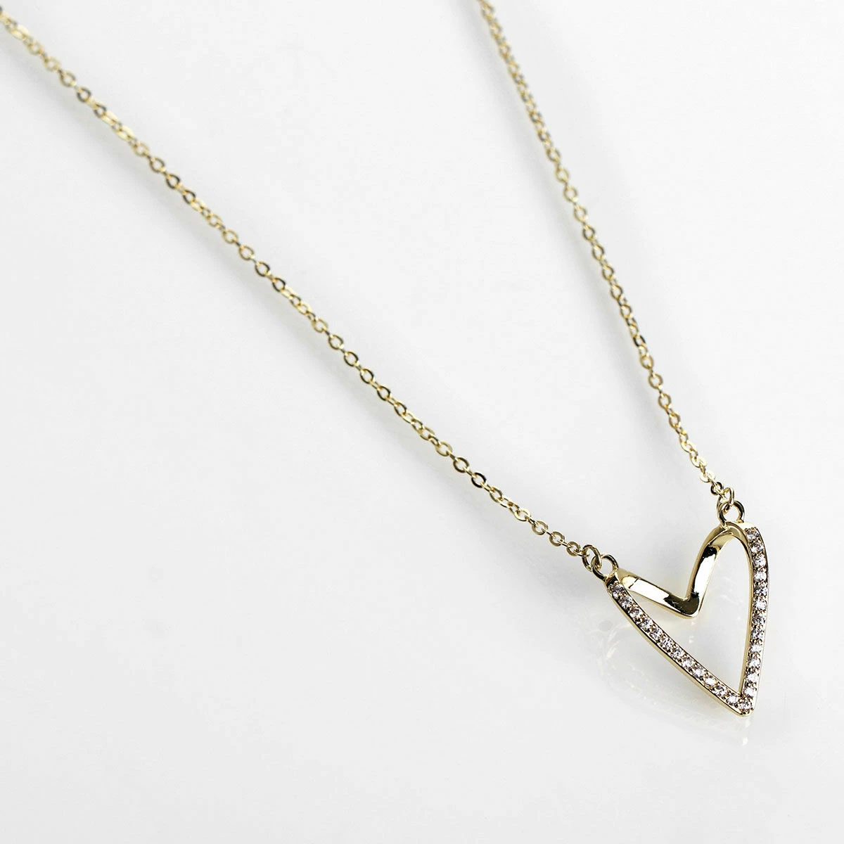 This delicate yet stylish necklace showcases a gold-plated simple line which forms a 3D heart. The outline of the heart is covered in clear pave gemstones which sparkle as they catch the light, whilst the underside of the top of the heart has a smooth finish. The pendant hangs from either side of the heart placing it in the centre of the dainty silver link chain when you wear it, and the chain secures with a metal clasp.