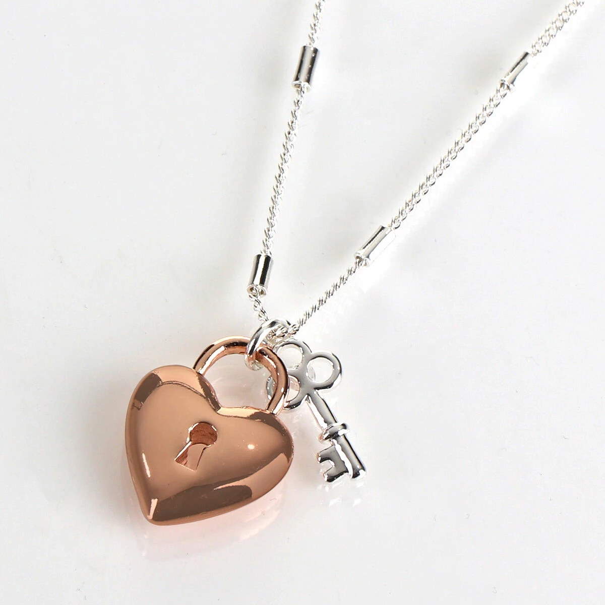 This beautiful necklace features a smooth rose gold heart-shaped padlock along with an ornate silver key complete with a diamante which sparkles in the light. The pendant hangs from a 48cm length silver chain and fastens with a hook and loop clasp.