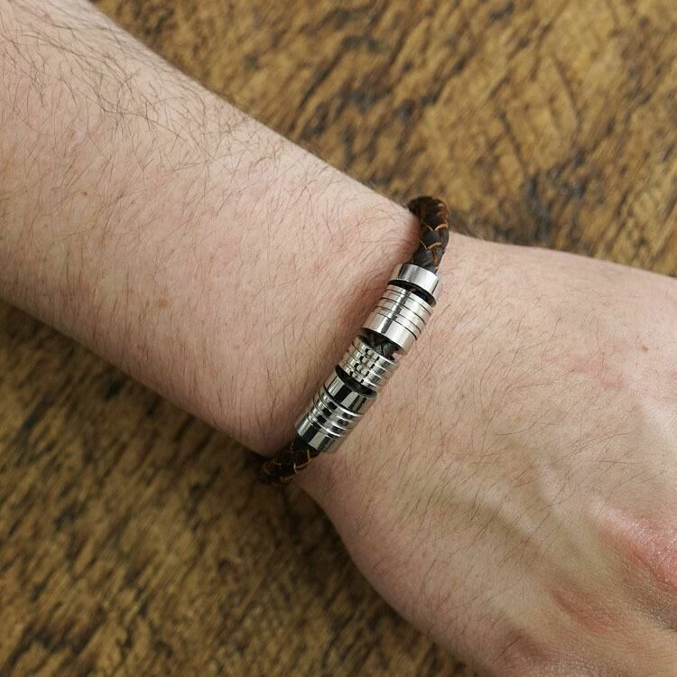 With a dark brown plaited effect running throughout the length of this bracelet, the main feature of the bracelet is the seven stainless steel rings, adding a modern and sharp element to the accessory. Fastened using the simple hoop and clip mechanism, this bracelet is a simple yet bold addition to any man’s outfit.