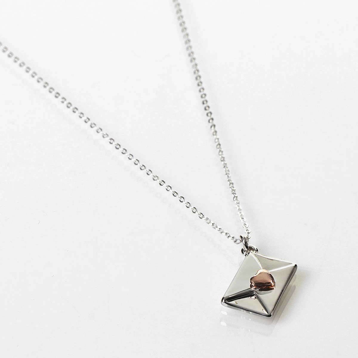 This beautiful necklace features a simple silver envelope with a rose gold heart sealing it shut. Open the envelope to reveal the message ‘on in a million’ written inside. The dainty pendant hangs from a silver chain which is approximately 45cm in length which fastens with a clip and loop mechanism. There is also a 5cm extension chain which allows you to adjust the length to your liking.