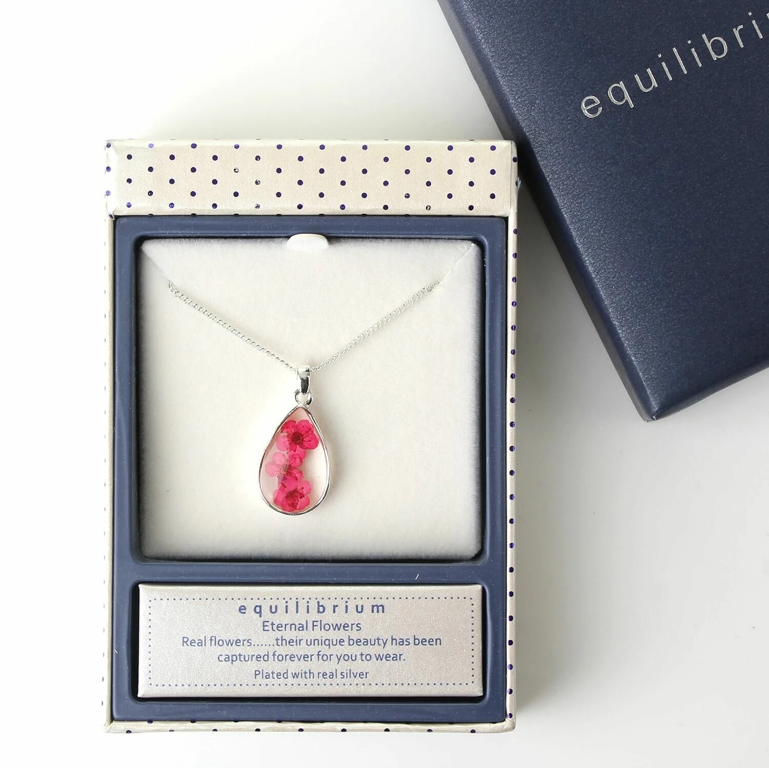 This lovely necklace from Equilibrium features small pink flowers, set inside clear resin in a tear drop shape. The outer edge of the pendant is lined with real silver plating, adding a sophisticated touch to the piece.