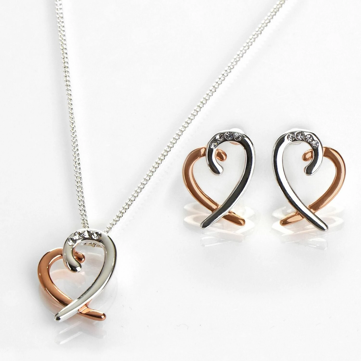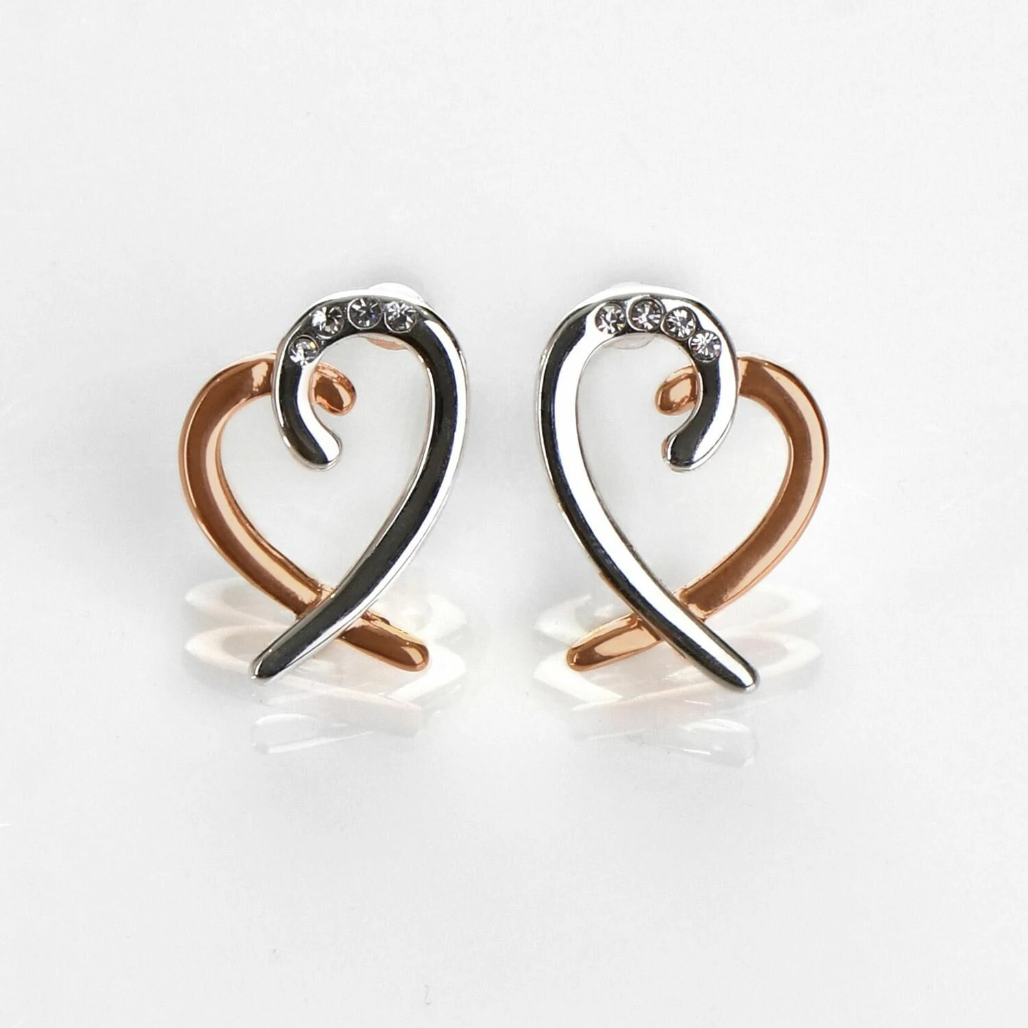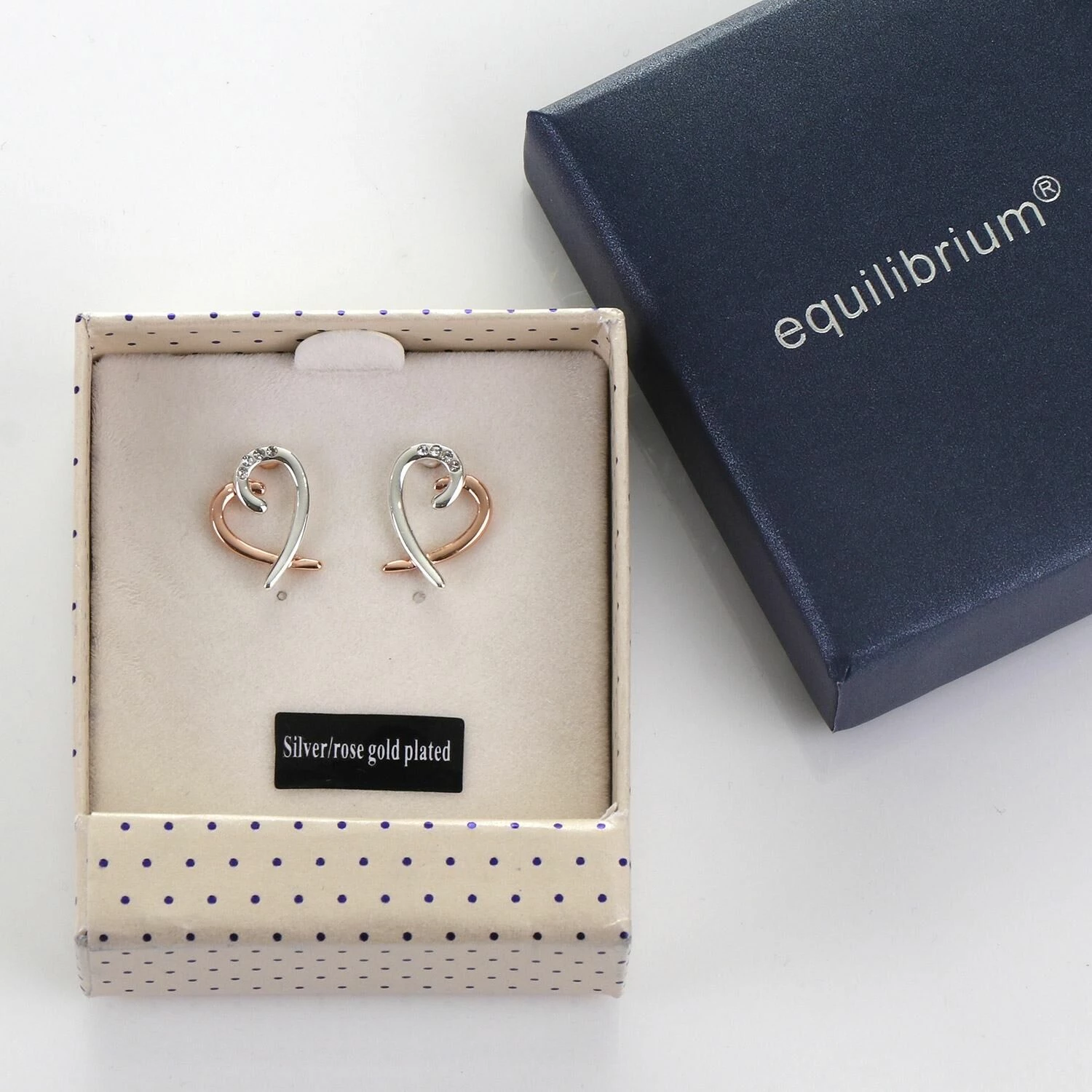 Designed as studs, these heart shaped earrings are polished silver with rose gold detailing. Two halves of a heart overlap in a simple and stylish fashion. The rose gold half sits underneath the silver half which is topped with four crystals that will catch the light making it shimmer. Each heart mirrors the other giving a sophisticated look.
