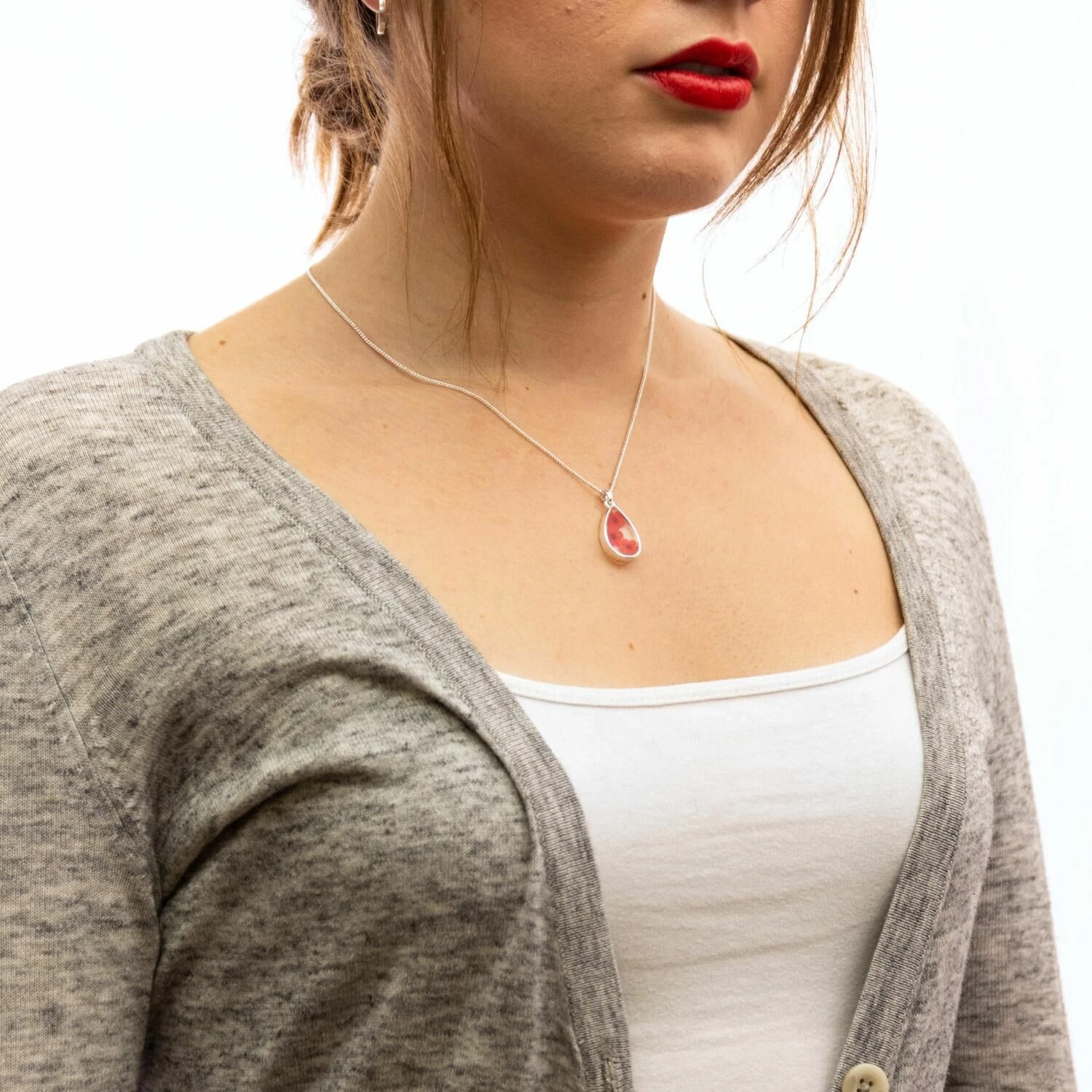 This lovely necklace from Equilibrium features small red flowers, set inside clear resin in a tear drop shape. The outer edge of the pendant is lined with real silver plating, adding a sophisticated touch to the piece.