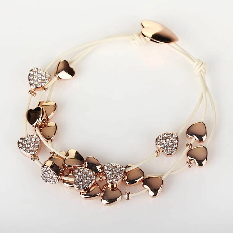This genuine leather bracelet has three separate straps joined by a button clasp. Each white leather piece hangs an array of rose gold hearts, some covered with crystals.