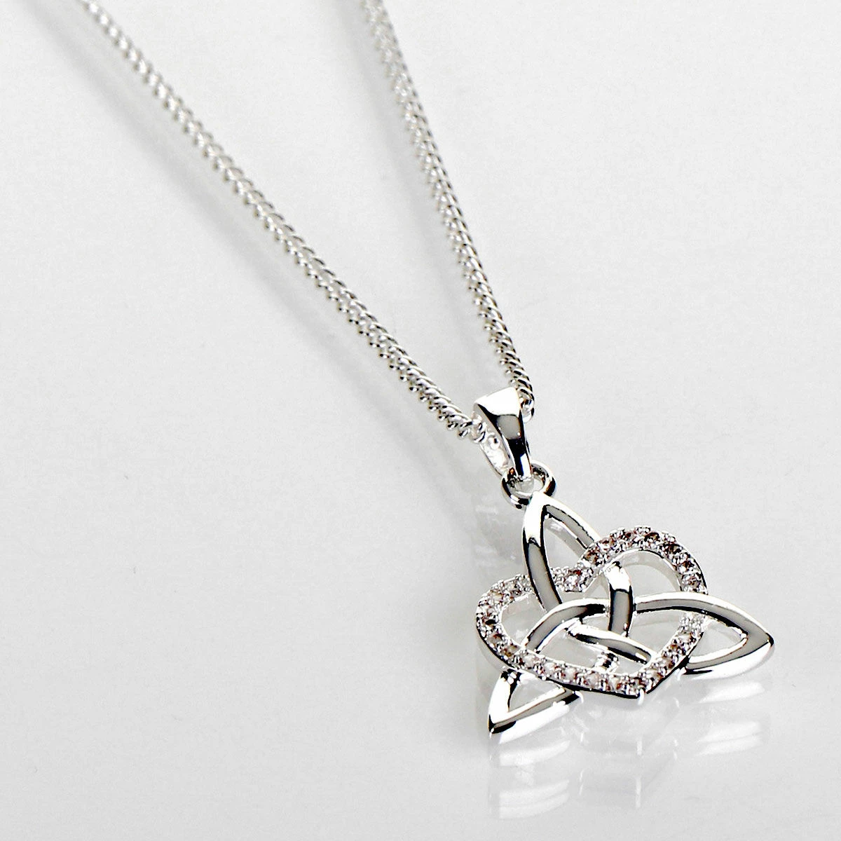 A silver plated Triquetra Celtic Knot is interlaced with a diamante heart, which is beautifully designed to shimmer in the light. The pendant hangs from a silver chain which is approximately 45cm in length which fastens with a clip and loop mechanism. There is also a 5cm extension chain which allows you to adjust the length to your liking.