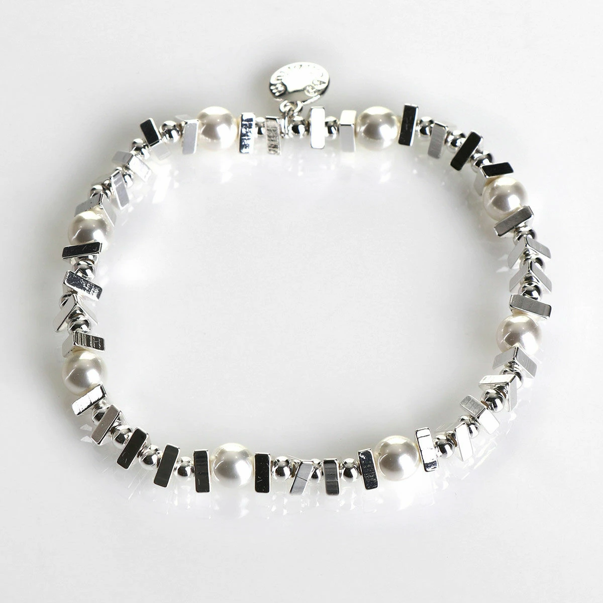 Round silver-plated beads are spaced between flat sliver triangles and contemporary pearls all strung on an elastic allowing it to stretch over your wrist. The bracelet is complete with the Equilibrium logo charm at the back.