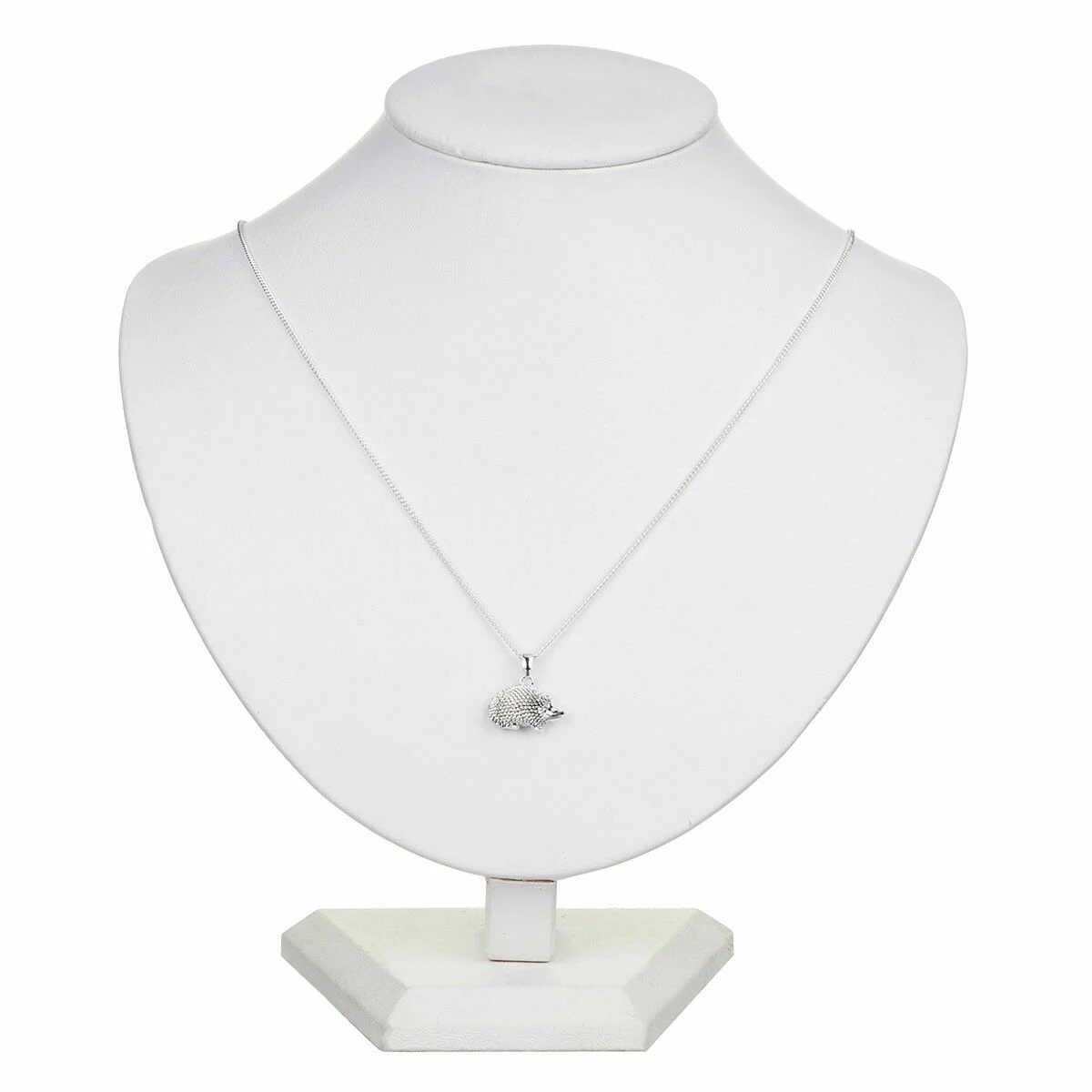 A cute little hedgehog with small spikes covering his body and a silver face which sparkles in the light. The pendant hangs from a silver chain which is approximately 45cm in length that fastens with a clip and loop mechanism. There is also a 5cm extension chain which allows you to adjust the length to your liking.