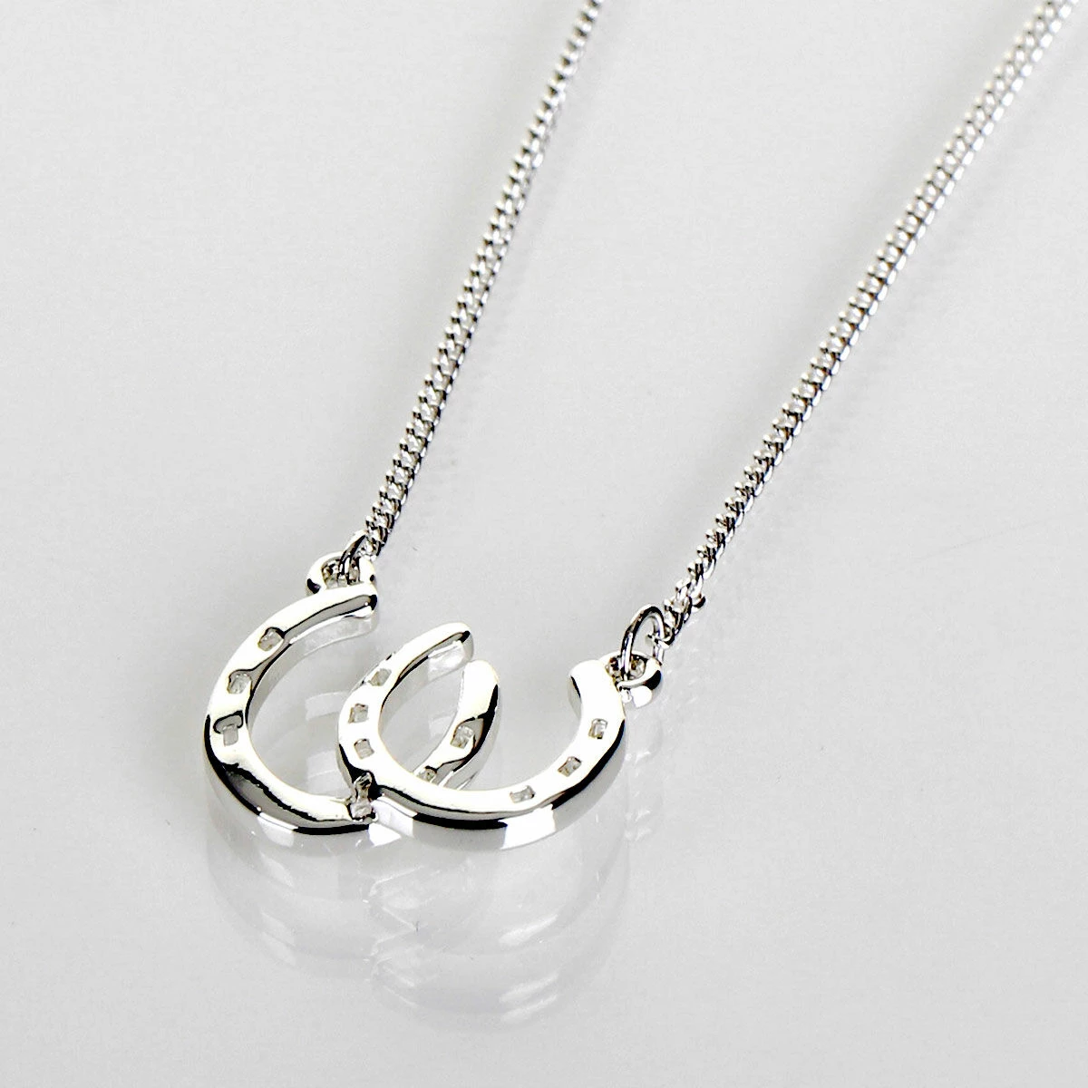 These two beautiful silver horseshoes are designed with intricate details, one overlapping the other, and complete with silver plating they will shimmer and sparkle as they catch the light. The pendant hangs from a silver chain which approximately 45cm in length which fastens with a clip and loop mechanism. There is also a 5cm extension chain which allows you to adjust the length to your liking.
