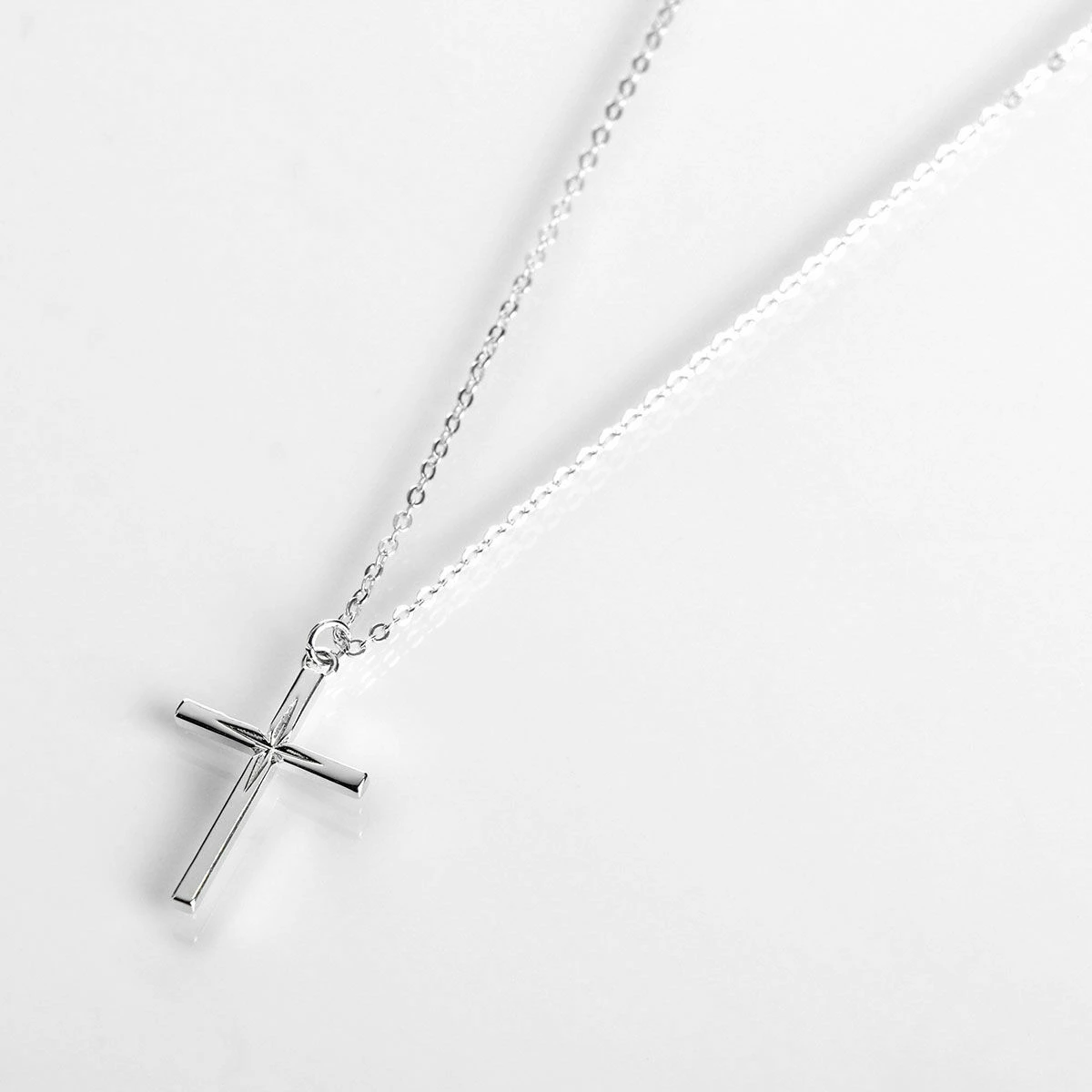 This delicate silver-plated piece is formed in the shape of a classic polished cross, debossed with a diamond cut cross creating a simply stunning pendant. This timeless piece will suit any outfit.
