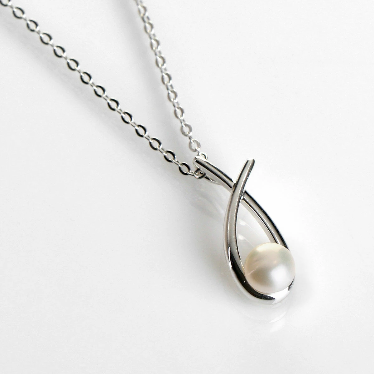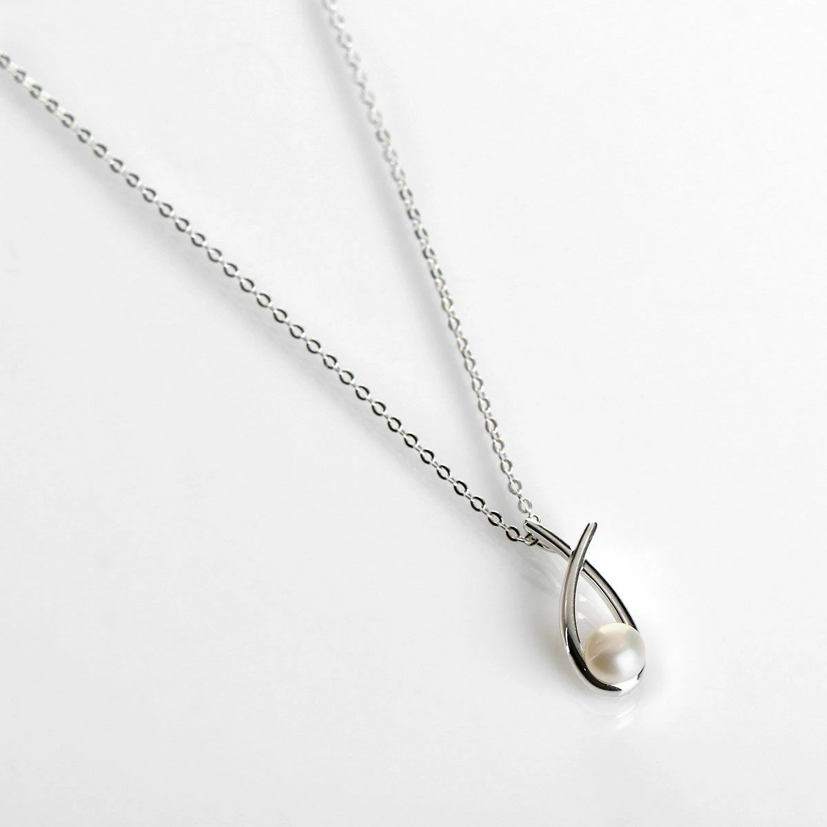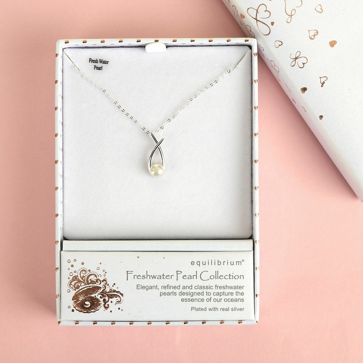 Hanging from a silver chain, the necklace features a pendant formed with a simple polished silver line which loops around and crossed over at the top forming a kiss ‘X’, the sophisticated design is complete with a single fresh water pearl which sits in the curve of the loop. The chain is 45cm in length and features a hook and eye clap with extender chain for you to adjust to your desired length.