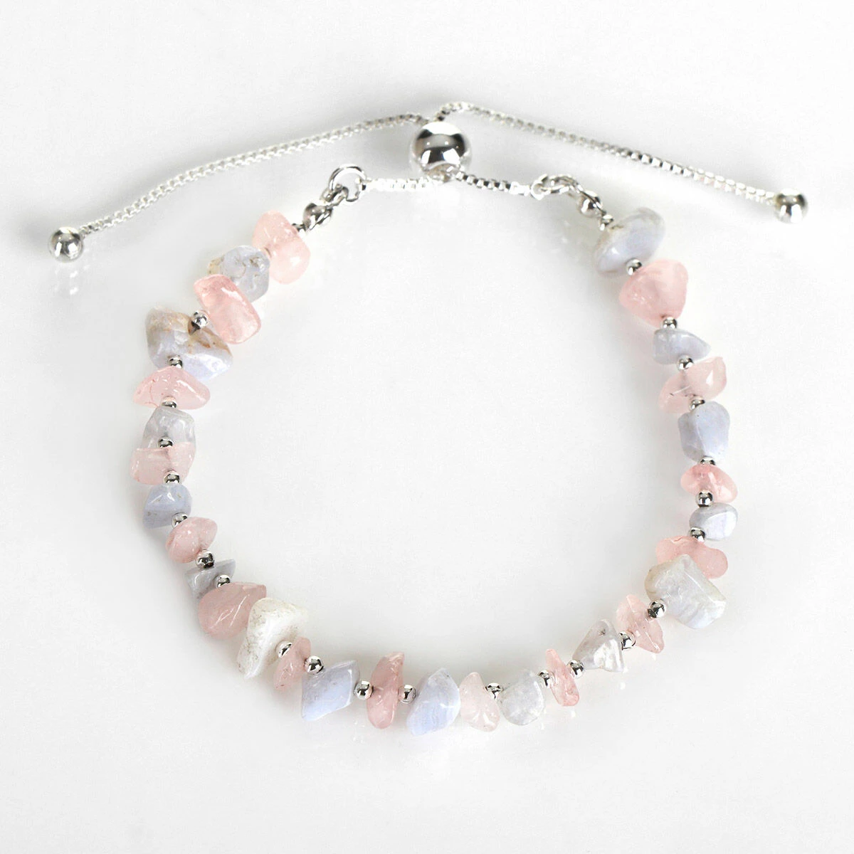 The bracelet is adorned with a multitude of gemstones, a combination of irregular shaped blue lace agate and pink rose quartz. Each stone is spaced with a silver-plated bead which allows the stunning gemstones to standout. To adjust the size of the bracelet there’s a single round silver bead pulley on a two small silver chains.