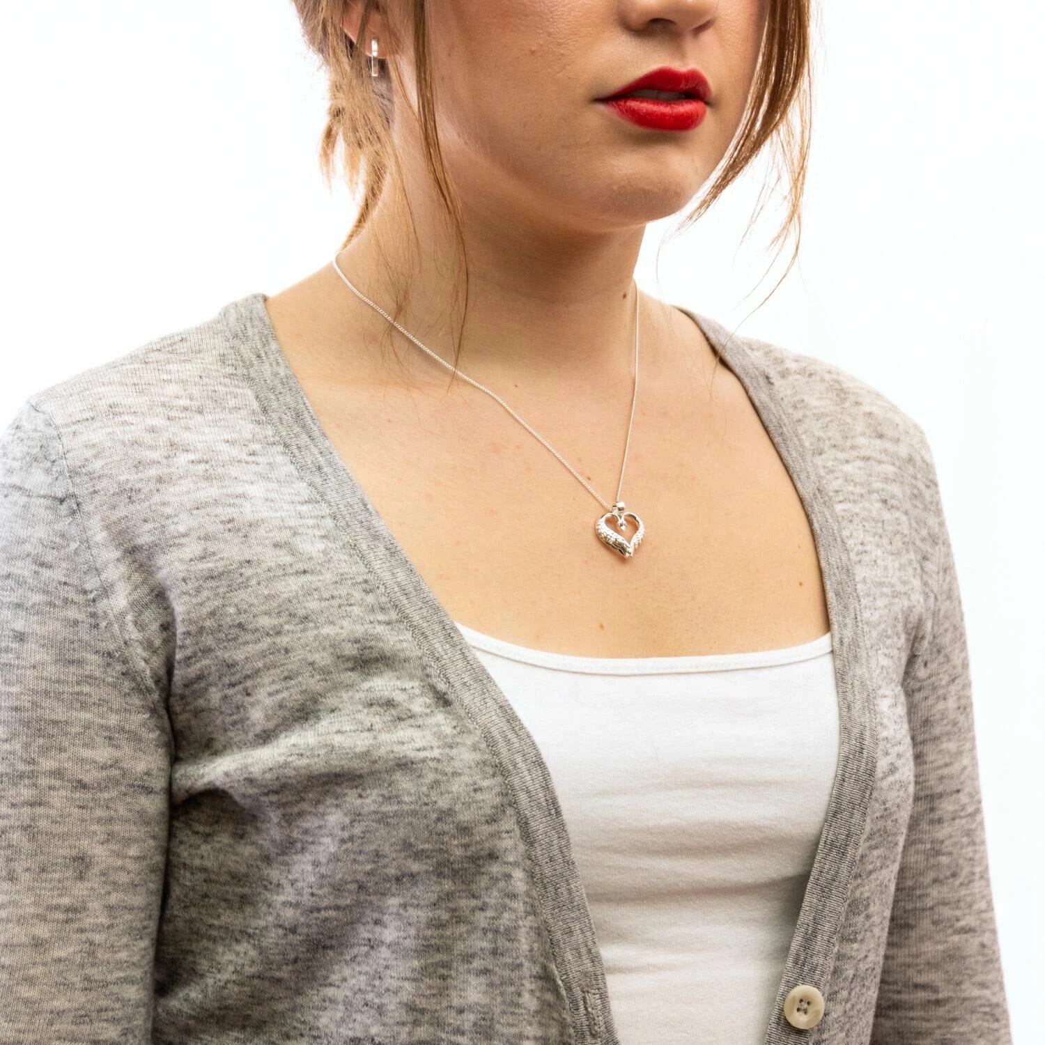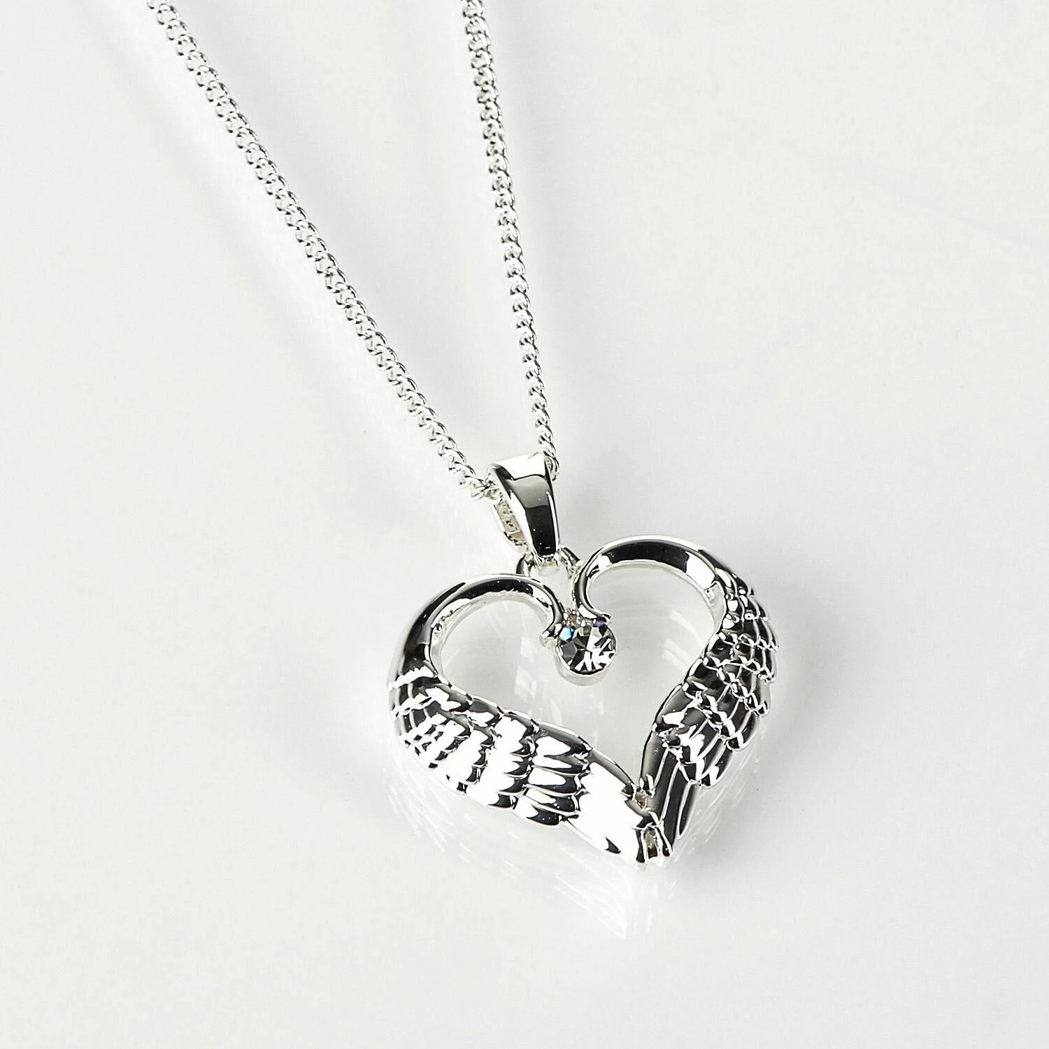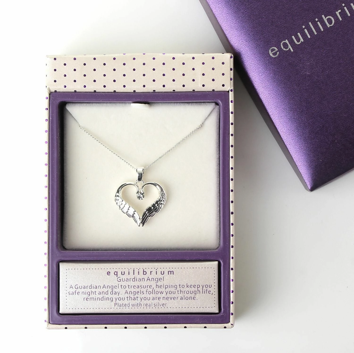 This gorgeous necklace from Equilibrium is plated with sterling silver and features a heart shaped pendant that is made out of a pair of angel wings. In the middle of the heart is a silver gem that catches the light beautifully and adds a touch of sparkle.
