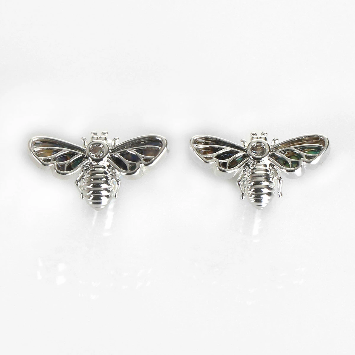 Each stud earring features little silver bee with ridged body and outstretched wings. Each wing is inset with the stunning Paua shell which adds colour and pattern to the design.