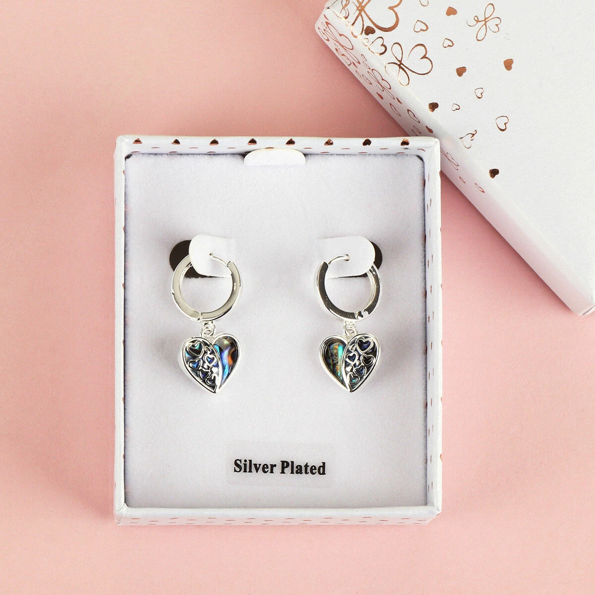 Each huggie earring has a gorgeous heart which hangs below, each features half covered with cut-out hearts and is inset with the stunning Paua shell which adds colour and pattern to the design.