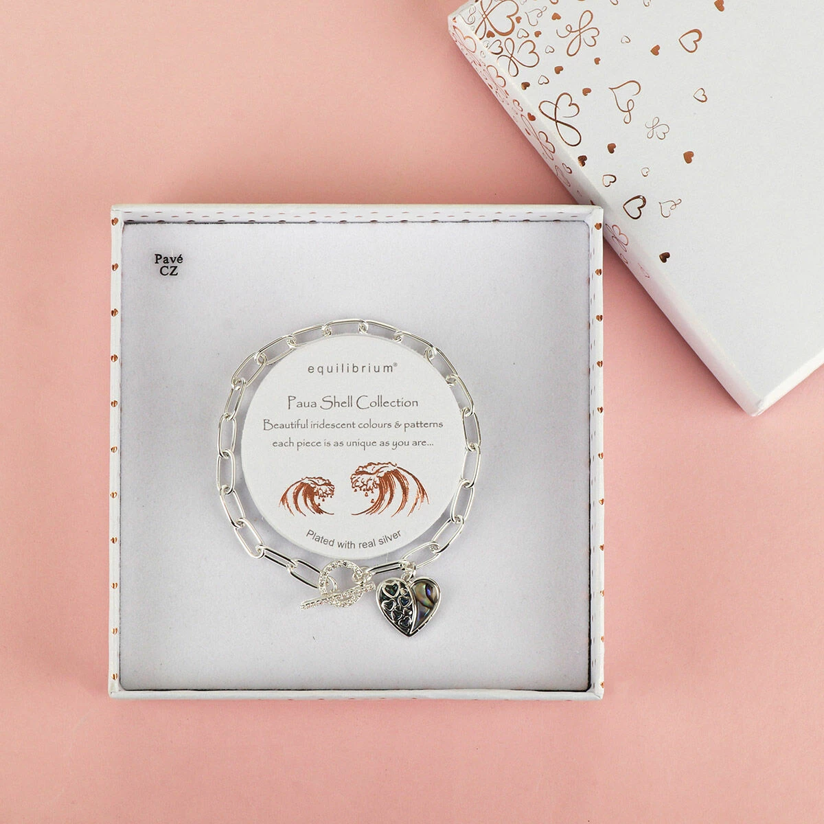 Add a sense of style and elegance to any outfit with this beautiful bracelet from Equilibrium. This stunning Paua shell hearts bracelet will make the perfect present for a friend or loved one.