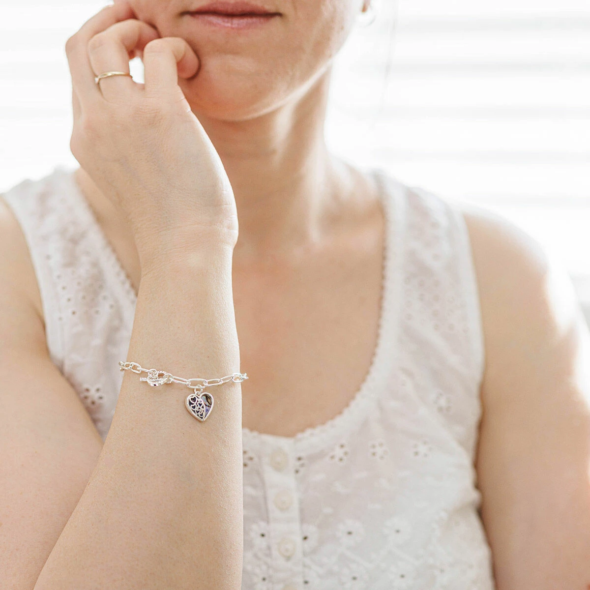 This stylish bracelet features a large heart with half covered with cut-out hearts and is inset with the stunning Paua shell which adds colour and pattern to the design. A series of silver links form the chain of the bracelet which fastens with a T-bar fastening that is encrusted with pave gemstone which add a touch of sparkle to the design.