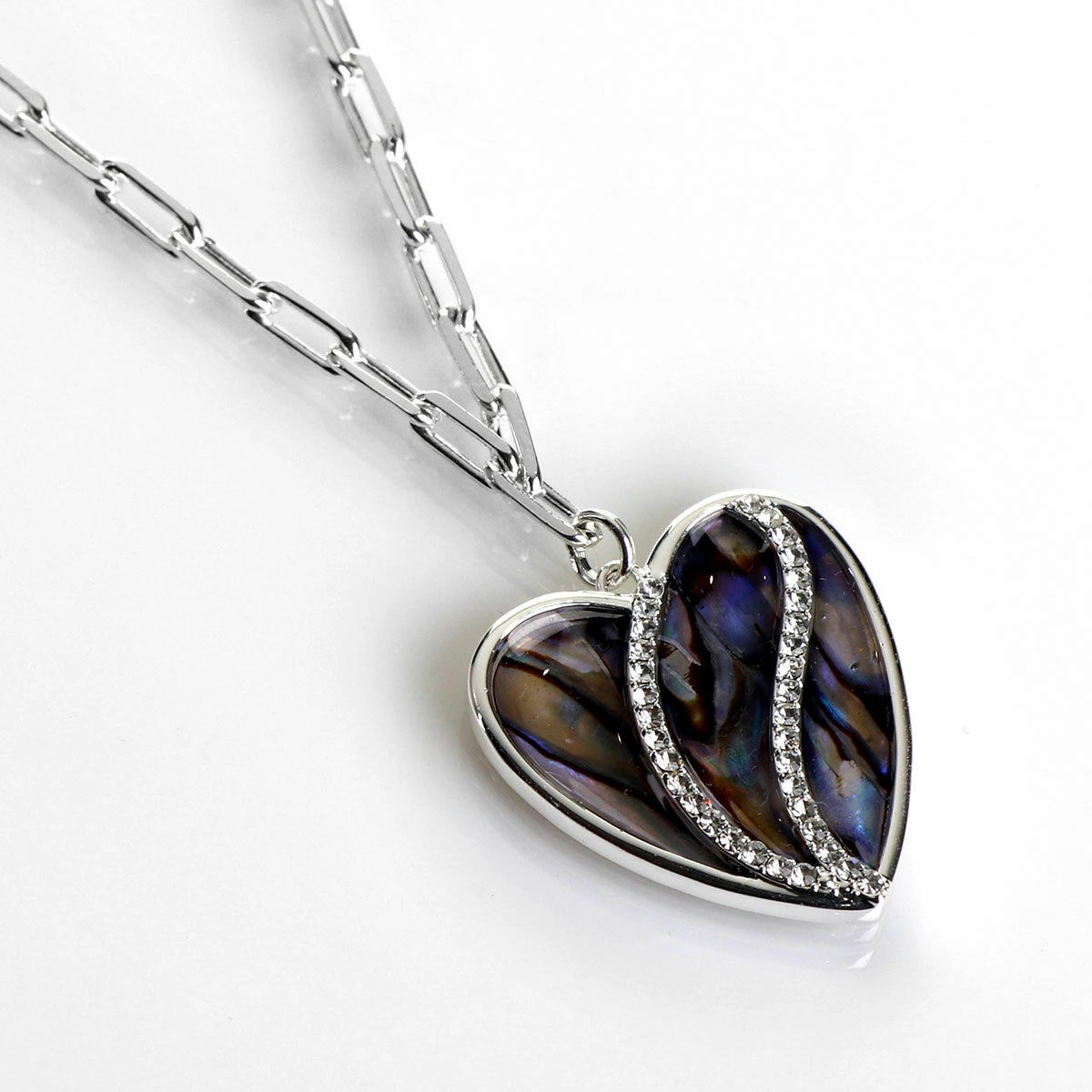 A gorgeous heart shape features the stunning Paua shell which adds colour and pattern to the design. The heart is divided with two curved lines filled with clear Pave gemstones which add sparkle as they catch the light. The pendant hangs from a large link silver chain which is approximately 66cm in length that fastens with a clip and loop mechanism.