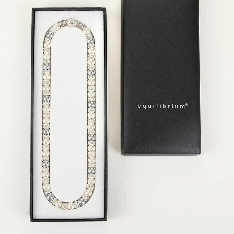 This delicate and sparkling necklace showcases a beautiful array of white and grey coloured pearls, nestled in-between a cluster of silver plated metal dividers. Further to this statement, the necklace secures with a clasp closure at the back, with signature equilibrium silver hanging token attached.