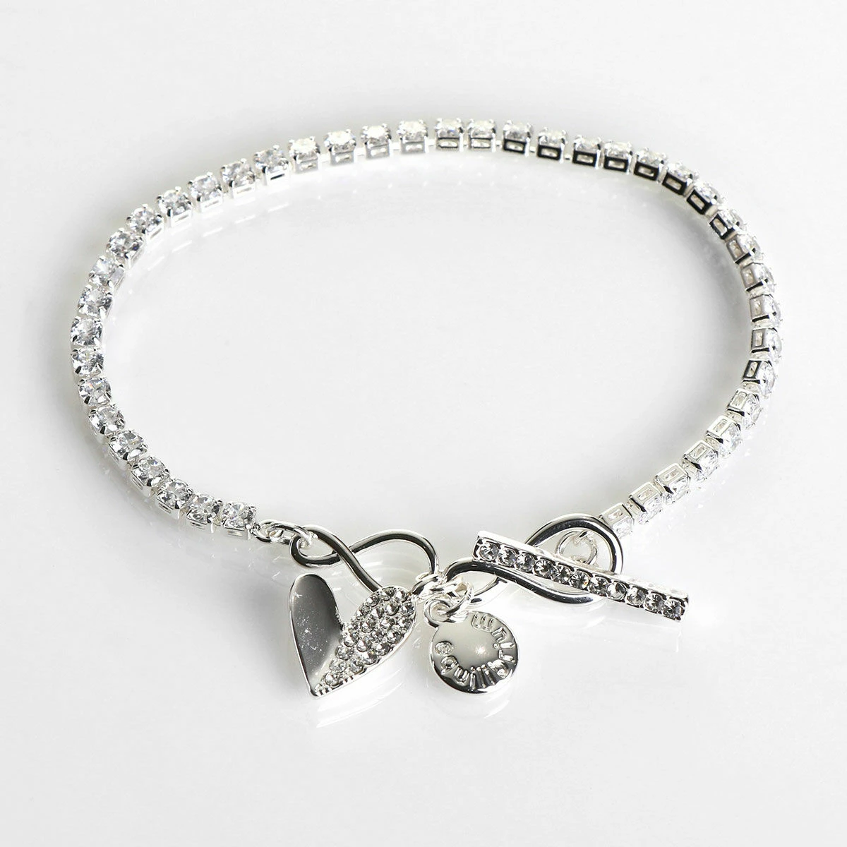 This stylish bracelet features a single heart which is folded in half giving a 3D effect which hangs from a smooth silver infinity charm. One half of the heart is smooth silver whilst the other half is covered in clear pave gemstones which sparkle as they catch the light. A series of clear square gemstones form the body of the bracelet which fastens with a T-bar fastening that is encrusted with pave gemstone which add extra sparkle to the design.