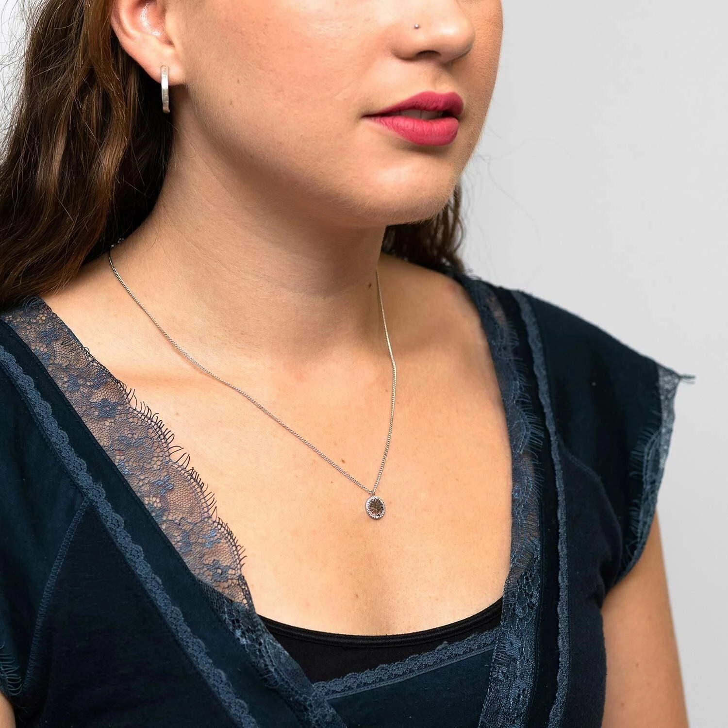 Strung on a silver chain, the necklace features a small, white gold plated charm. It is circular in shape with the Tree of Life in the middle. Around the edge of the charm are Pavé set CZ crystals that sparkle when the charm, which hangs freely from the chain by a silver link, catches the light. Â