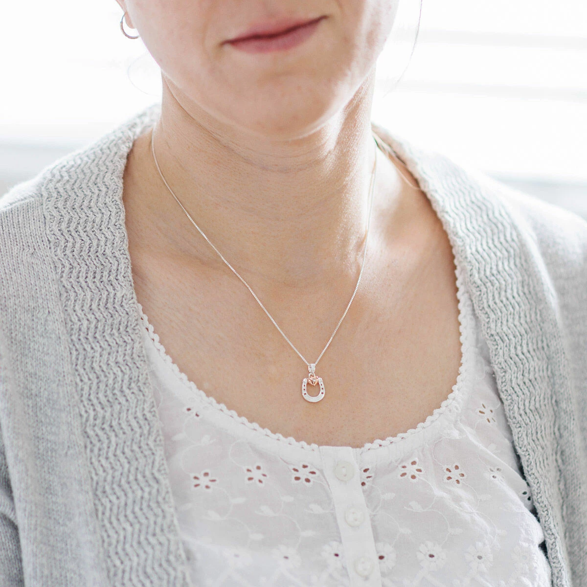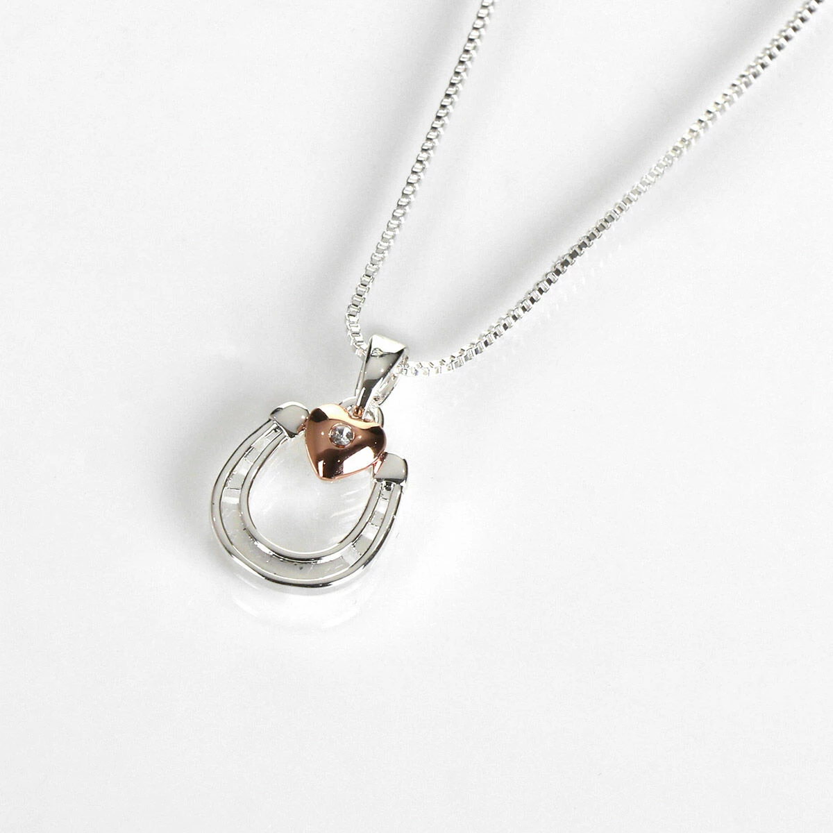 Strung on a silver-plated chain, 44cm in length, the necklace features a smooth silver horseshoe complete with a rose gold heart with gemstone set in the top. The chain fastens with a hook and eye clasp and features an extender chain which allow you to adjust it to your desired length. This elegant piece of jewellery is perfect for adding a touch of sparkle and class to your outfit.