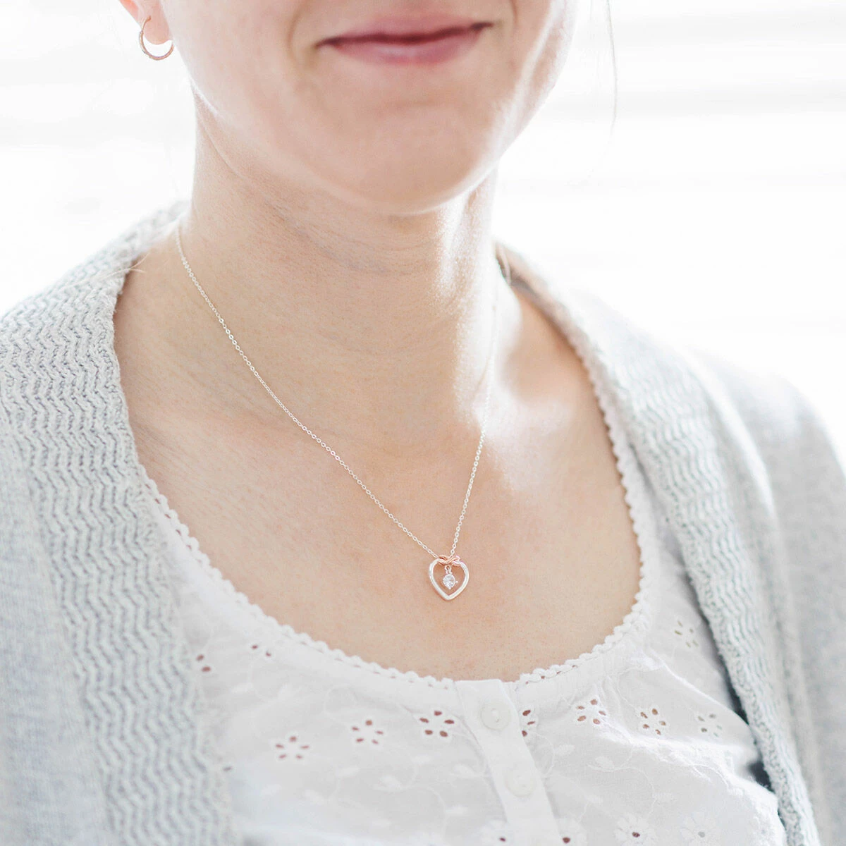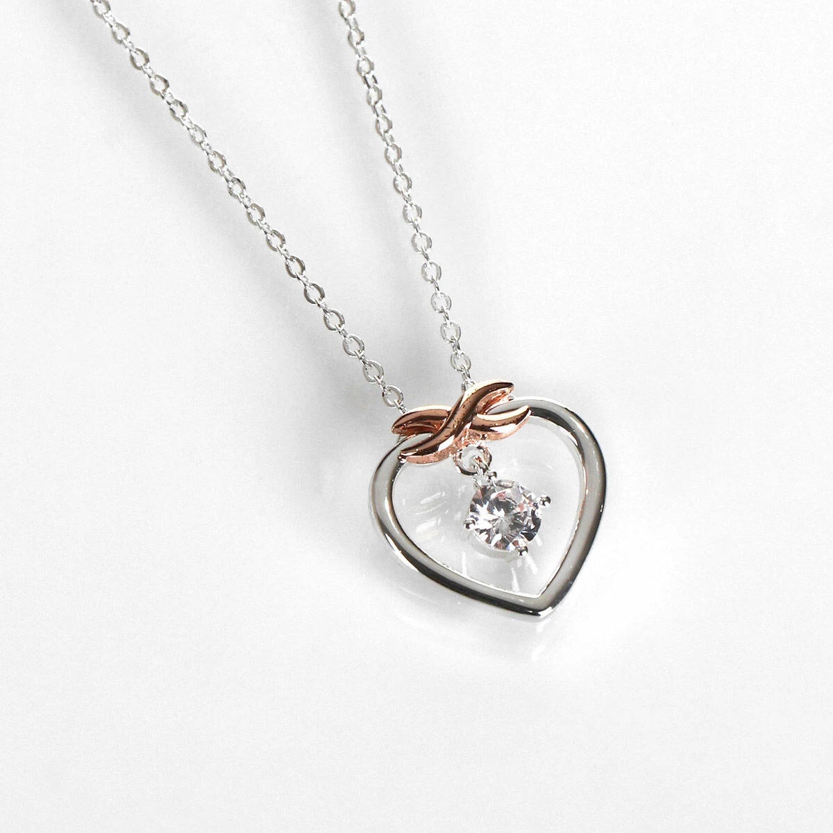 This stunning necklace features a fabulous, polished silver and rose gold pendant. A sleek silver heart outline is topped with a rose gold kiss, hanging inside the heart pendant is a single clear gemstone which will sparkle as it catches the light. This pendant is set upon a silver chain which measures 45cm in length with a 5cm extension chain and fastens with a spring clasp.