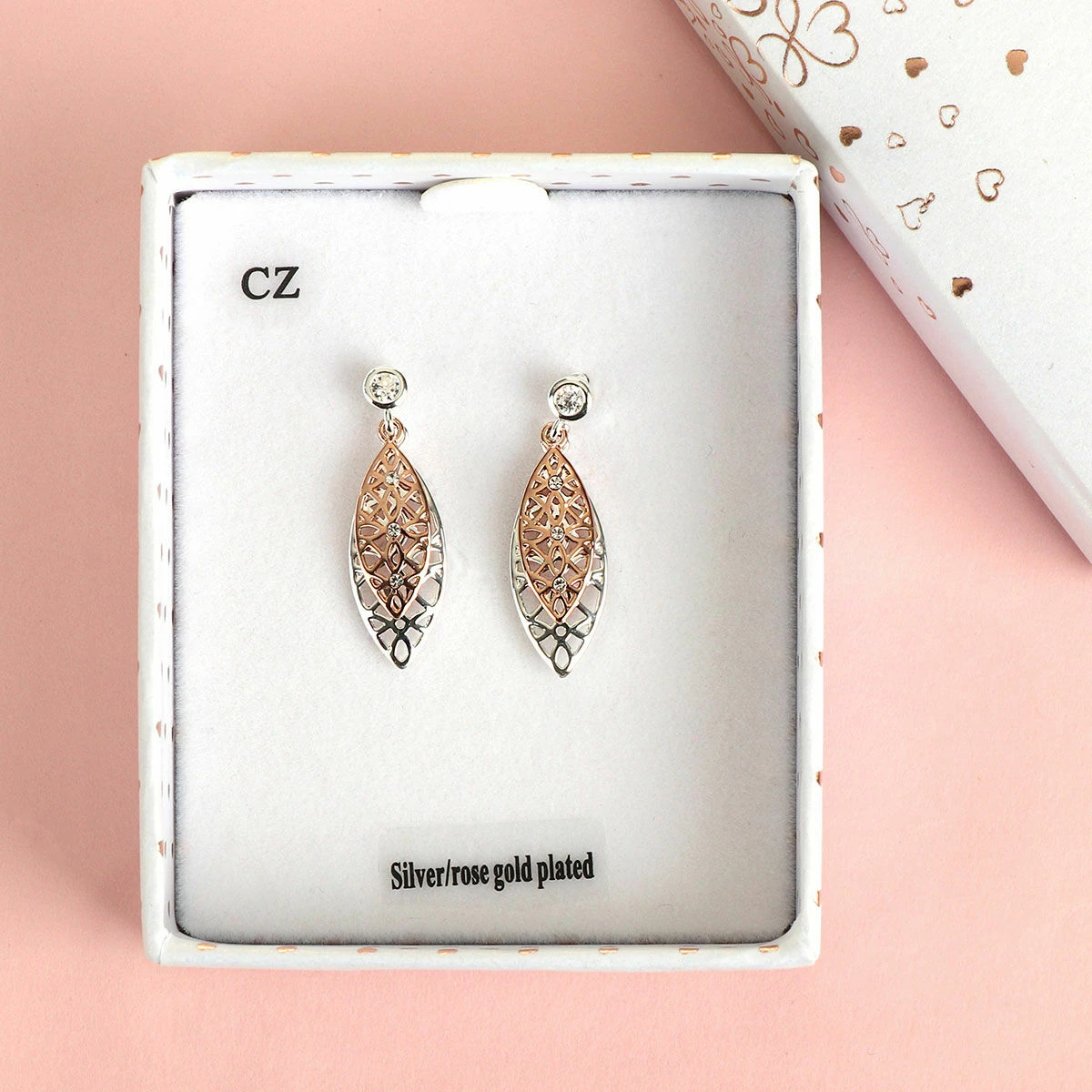 This delicate stud drop earring showcase a duo of ornate filigree leaves. One polished rose-gold filigree leaf, with dainty gemstones, sits on top of a larger polished silver filigree leaf. The leaf hangs from a single gemstone stud earring. An elegant piece of jewellery to complete any outfit whether you’re going to work, out for an occasion, or even doing the school run!