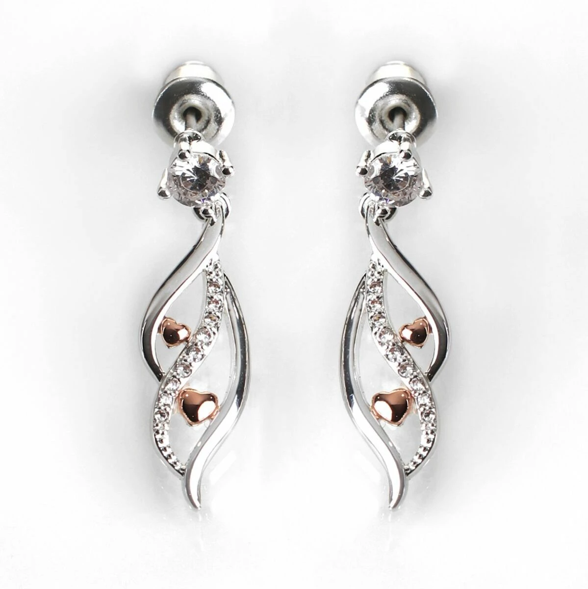 Each earring features a stunning drop made up of three ripples, two smooth silver and the middle curve is encrusted with pave Czech crystals. Nestled in between the ripples are two rose gold hearts which compliment the chic design. The piece is complete with a single gemstone at the top which adds to the beautiful sparkle when it shimmers in the light.