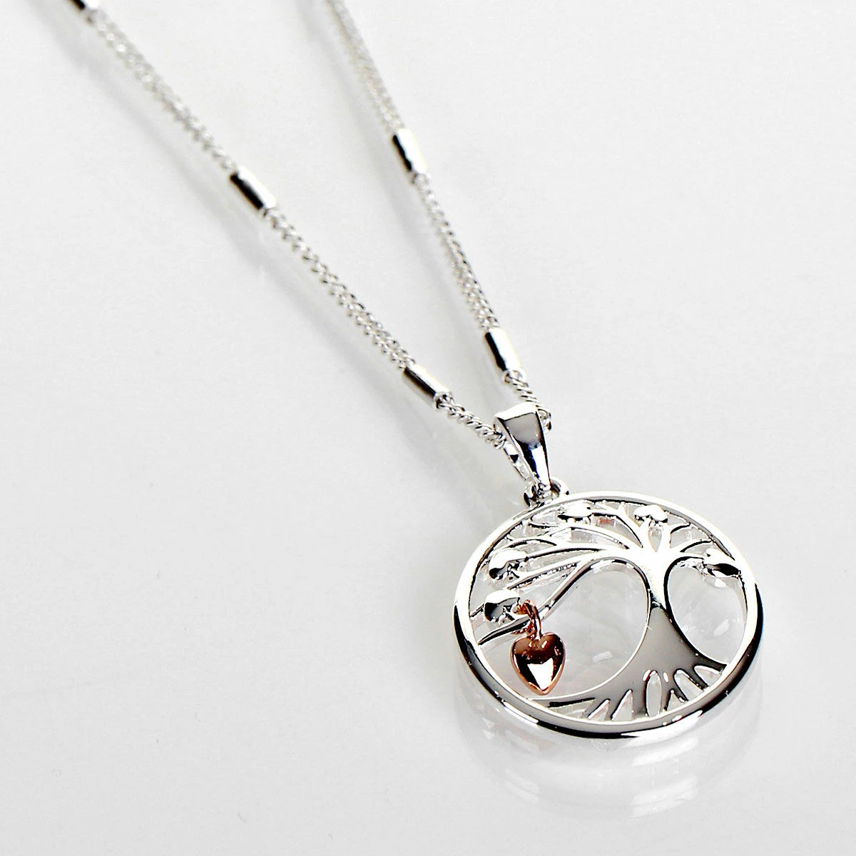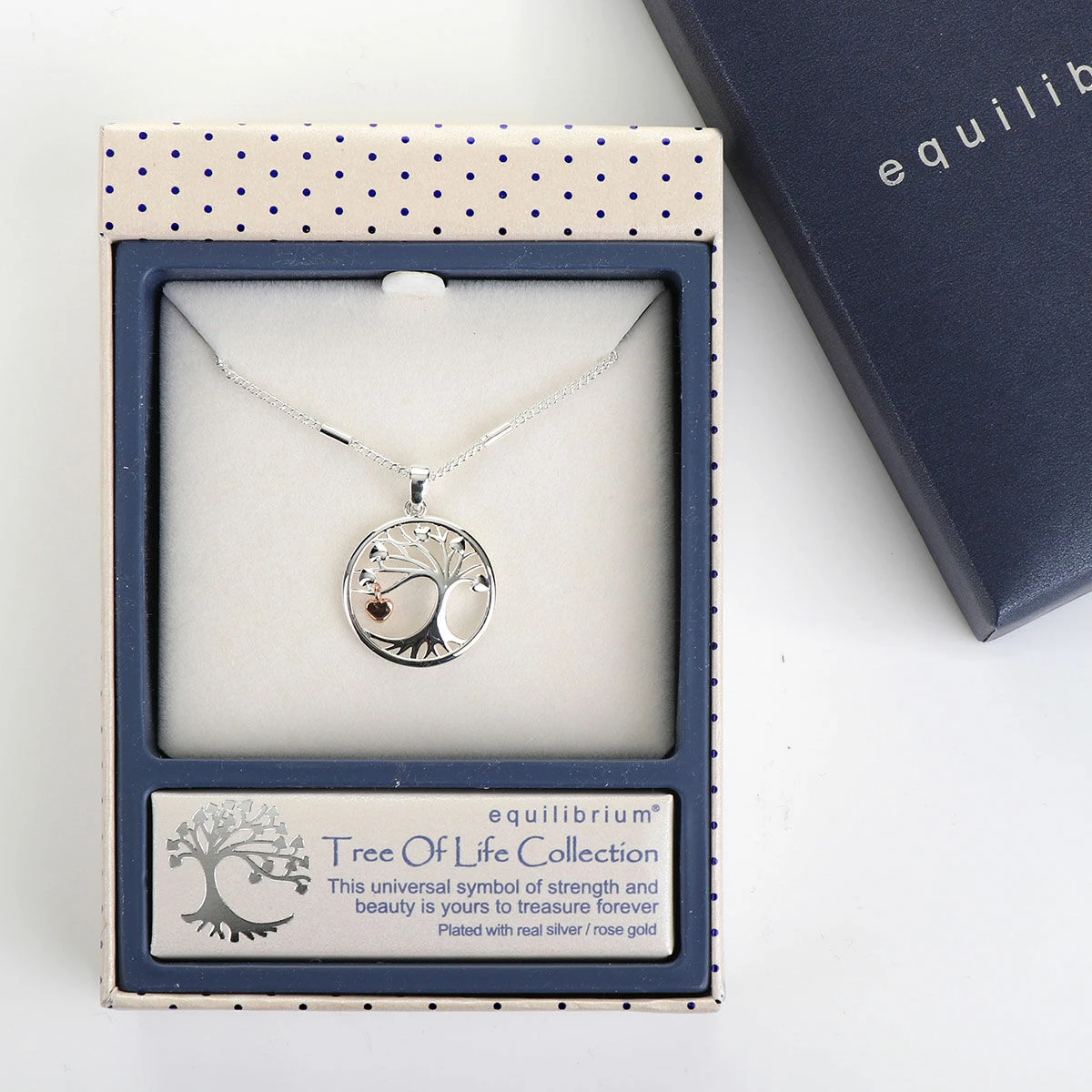 A beautiful silver tree complete with small silver hearts and a rose gold heart dangling from one of the branches. The silver tree sits in a circular pendant which hangs from a silver chain that is approximately 45cm in length and fastens with a clip and loop mechanism. There is also a 5cm extension chain which allows you to adjust the length to your liking.
