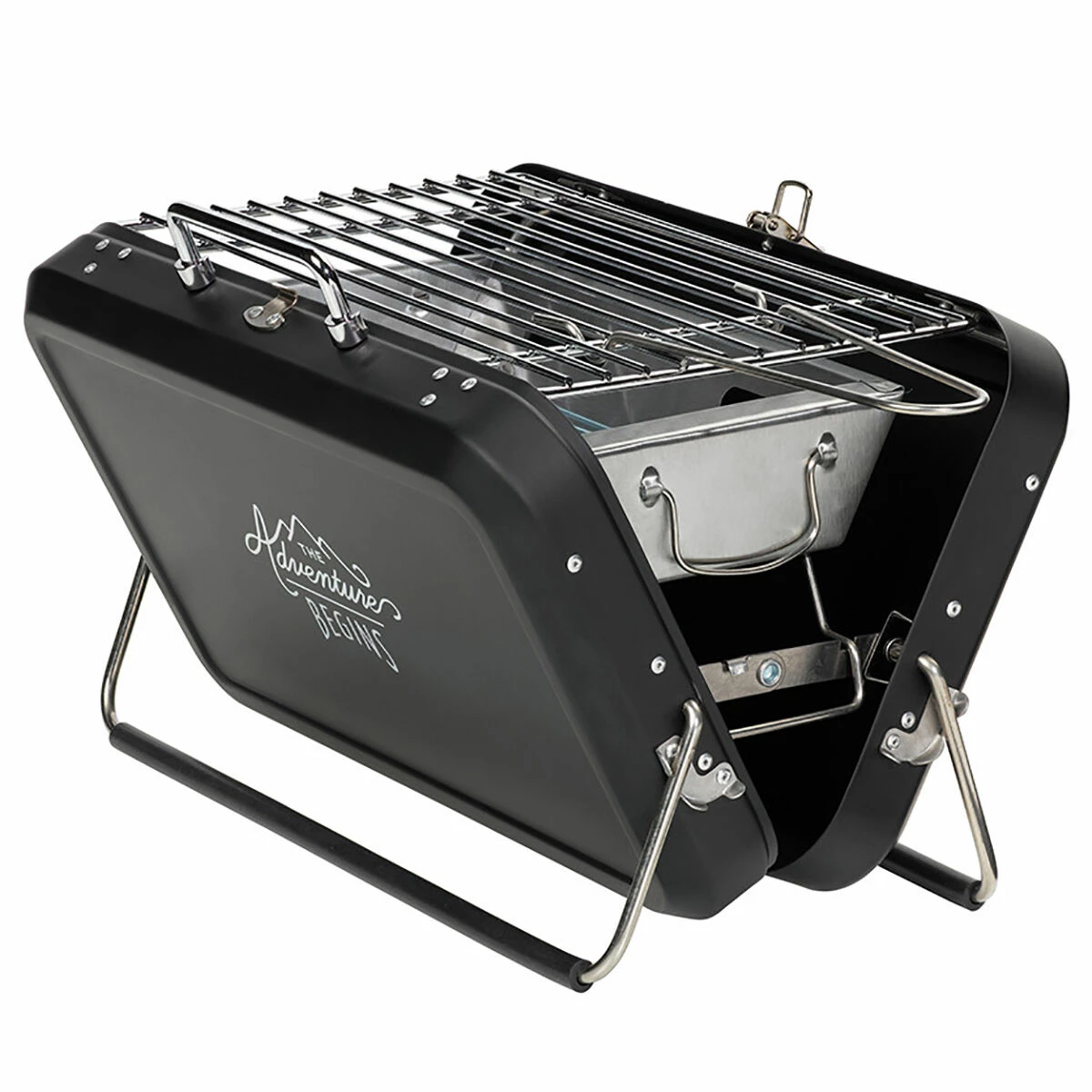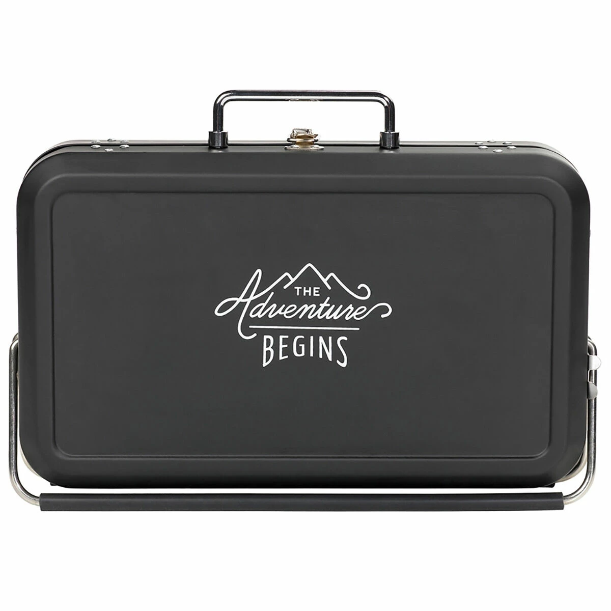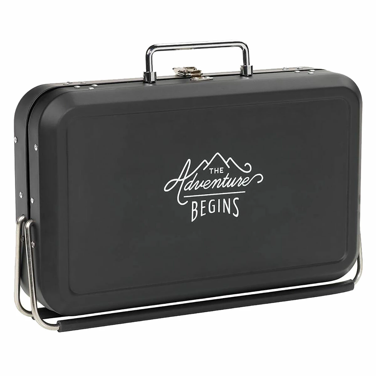 The entire BBQ fits into what appears to be a small suitcase, given away only by the text โthe adventure beginsโ which is emblazoned on the side. All that is required is to add the coal, and, of course, the meat!