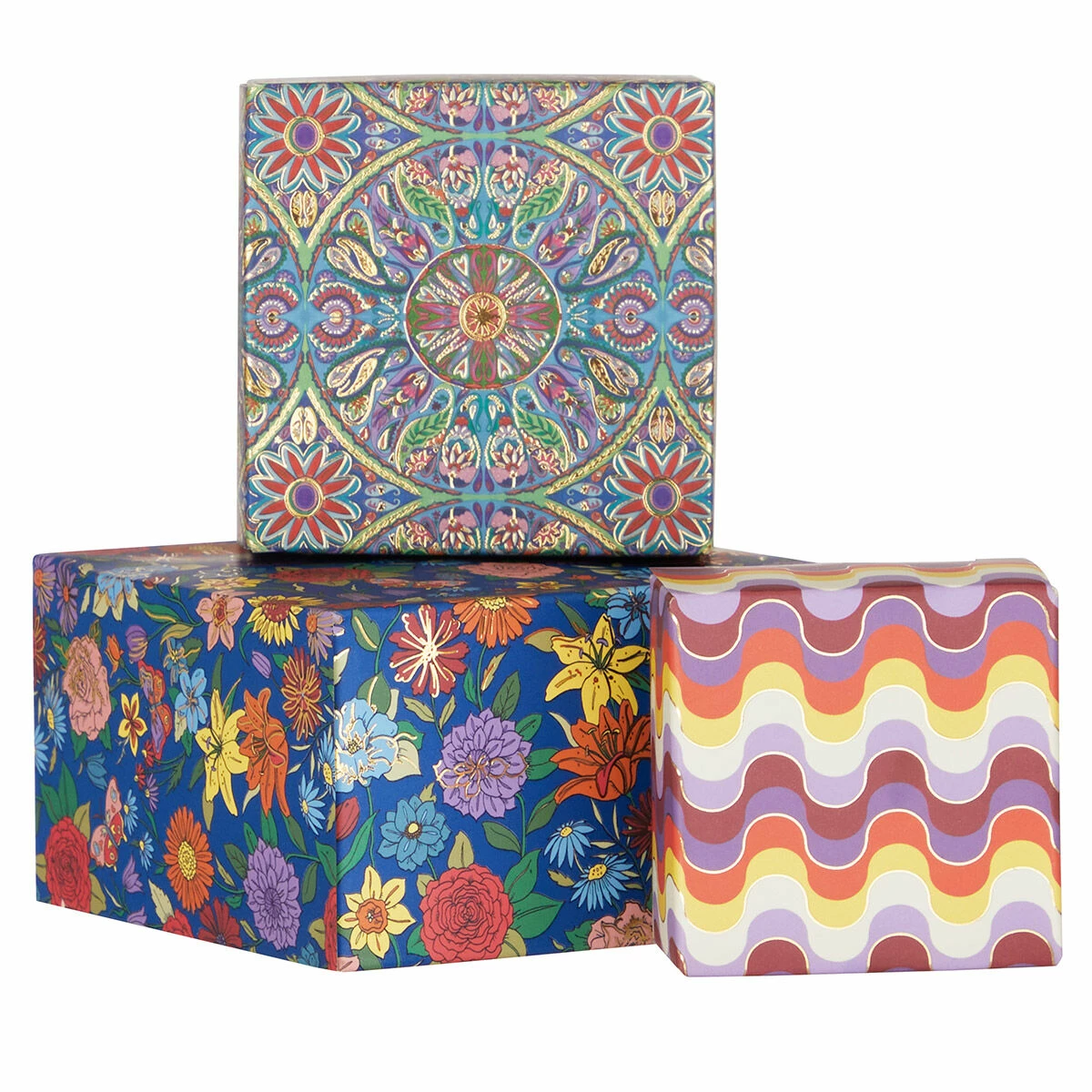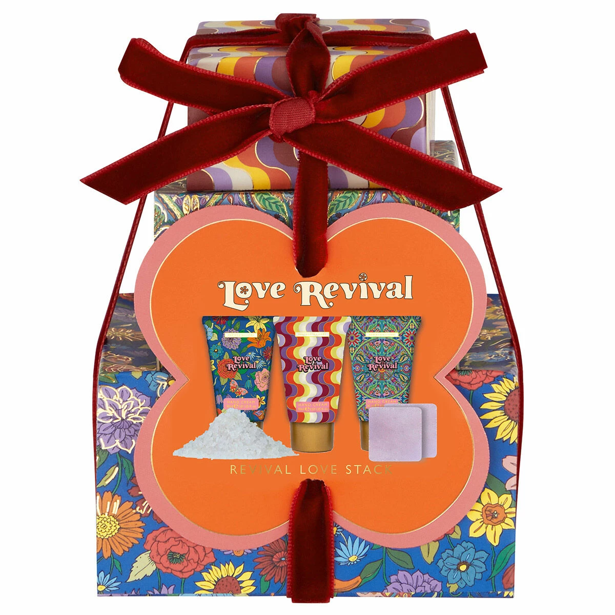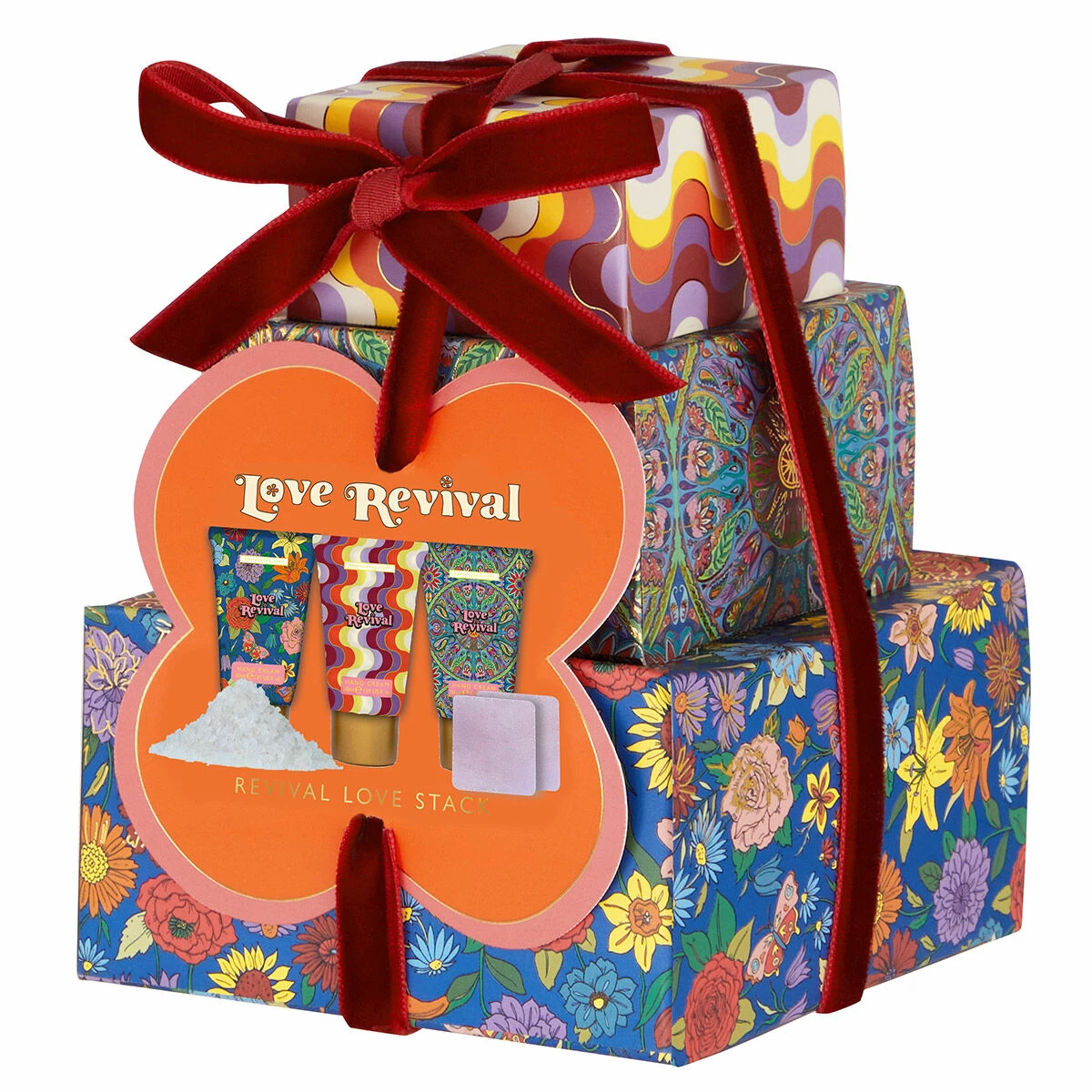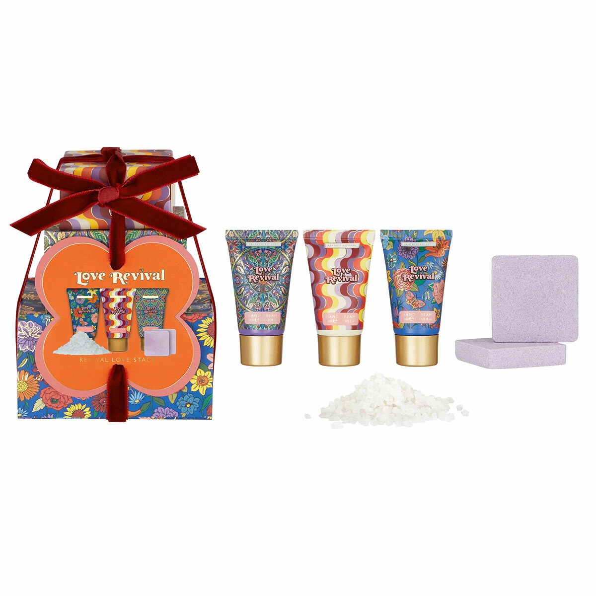 This stylish ‘love stack’ consists of three boxes each one featuring vibrant bold flowers, a wavy pattern and a pattern of florals and foliage. One box holds a trio of nourishing hand creams for you to pop in a bag for keeping your hands soft and smooth. The second box hold two bath fizzers for you to relax and unwind in a bath with, and the third box has bathing soak crystals, which will help cleanse your skin whilst emitting a gorgeous fragrance of a fresh fruity bouquet of eucalyptus, lavender and patchouli essential oils that are perfectly complimented by fresh green leaves, delicate lily of the valley and warm sandalwood that will relax and revitalize you.