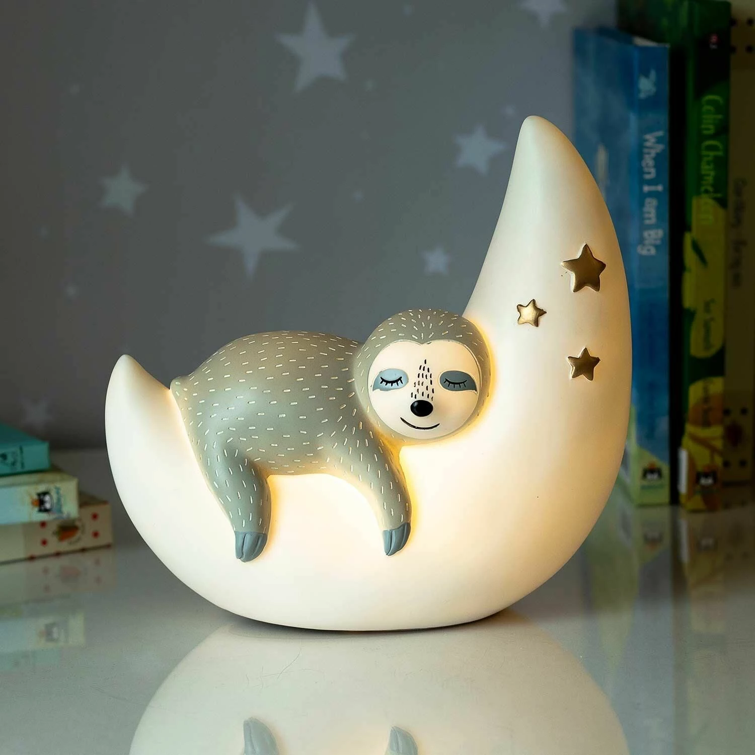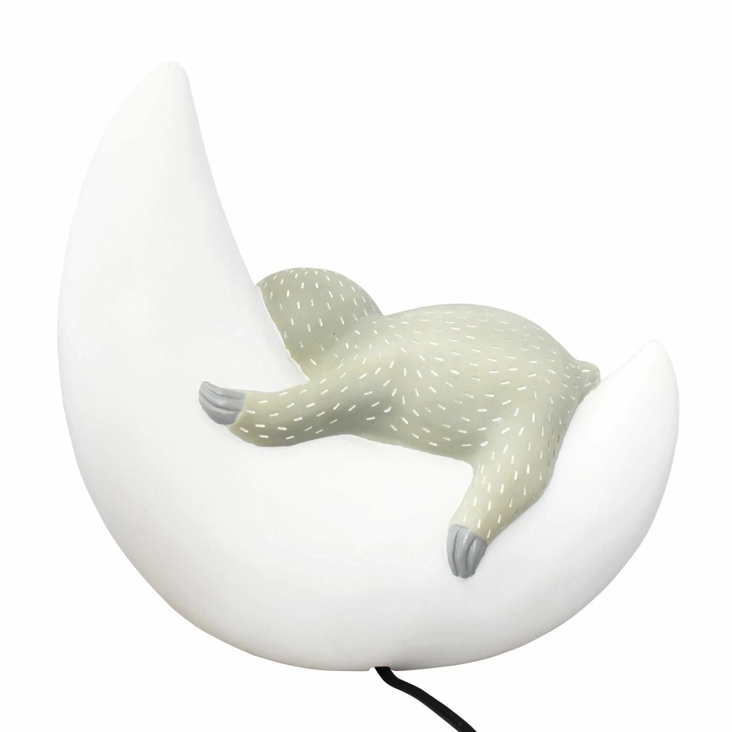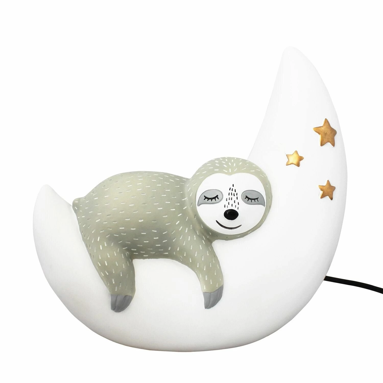Featuring a delightful sloth curled up on a crescent moon decorated with gold stars, this lamp is made from polyresin for a safe and bright light. Comes with a black cable and switch and a UK 3-pin plug for easy use.