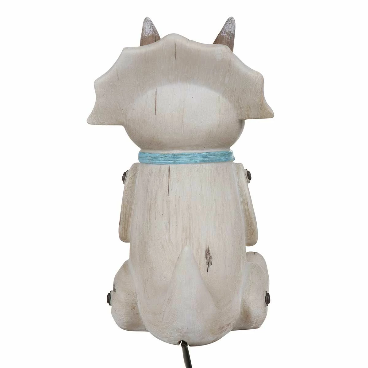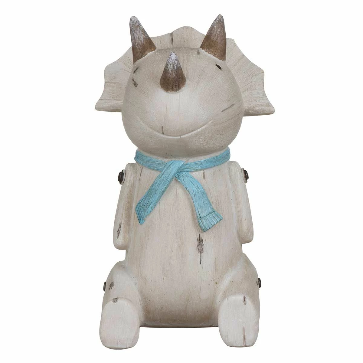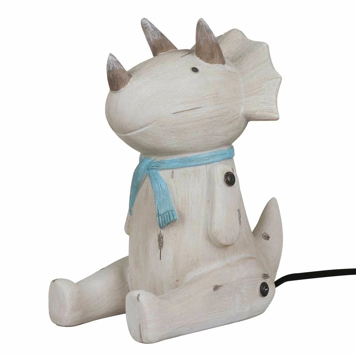 The fun lamp is inspired by classic children’s wooden toys. The polyresin lamp features an enchanting appearance which is designed to look like wood effect. This sitting triceratops lamp is cream with a tactile exterior, the resin features grooves and grey lines representing carved wood and the dinosaur’s limbs appear to have screws through them attaching them to the body. This taupe dinosaur sits on its hind legs, with its tail curved up behind him, he features a distinctive head with a frill and 3 horns. His cute little face features black eyes and little smile, he is even wearing a pale blue scarf around his neck!