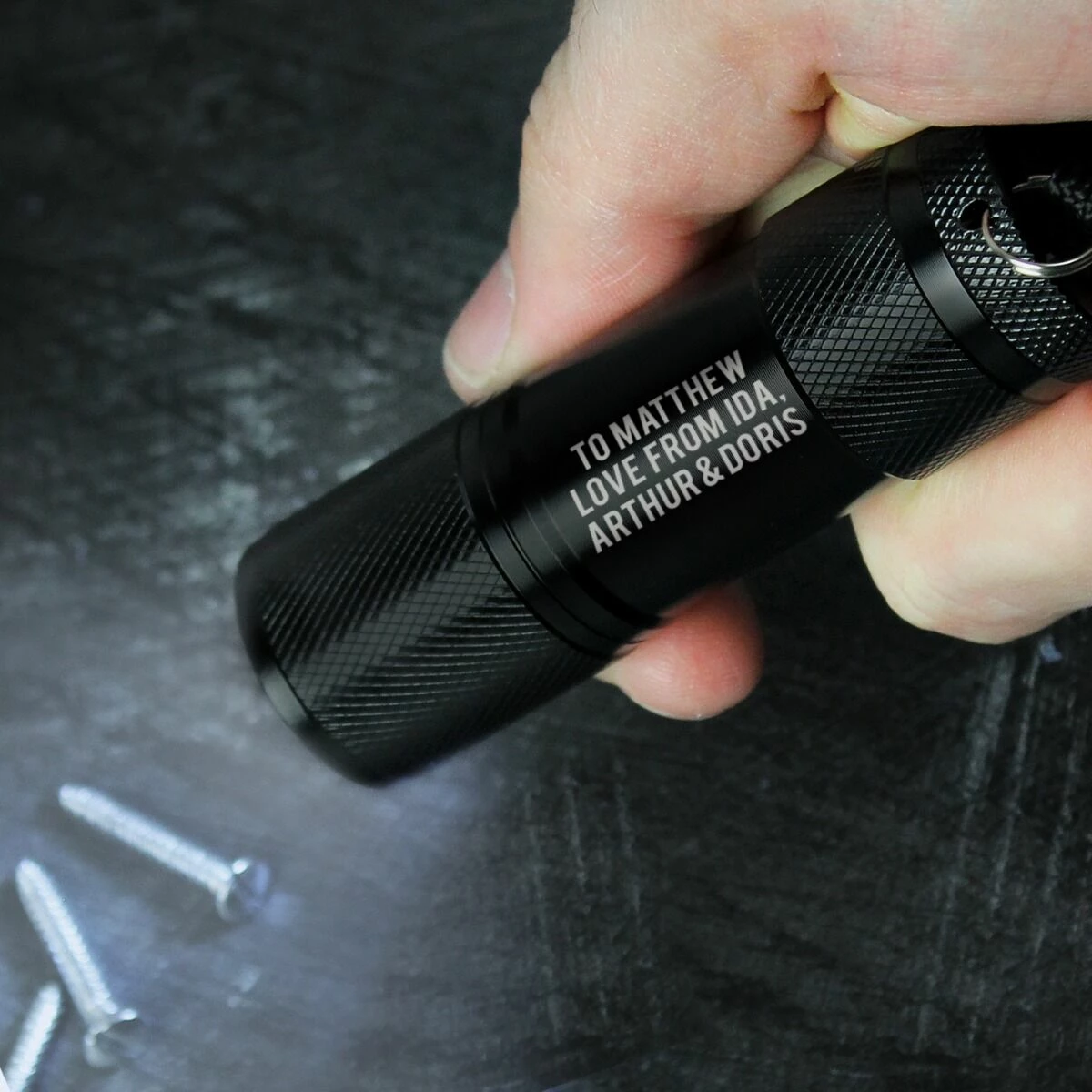 This stylish, pocketable black torch is not only practical, but it can also be personalised with a three-line message for a unique touch that any recipient is sure to love!