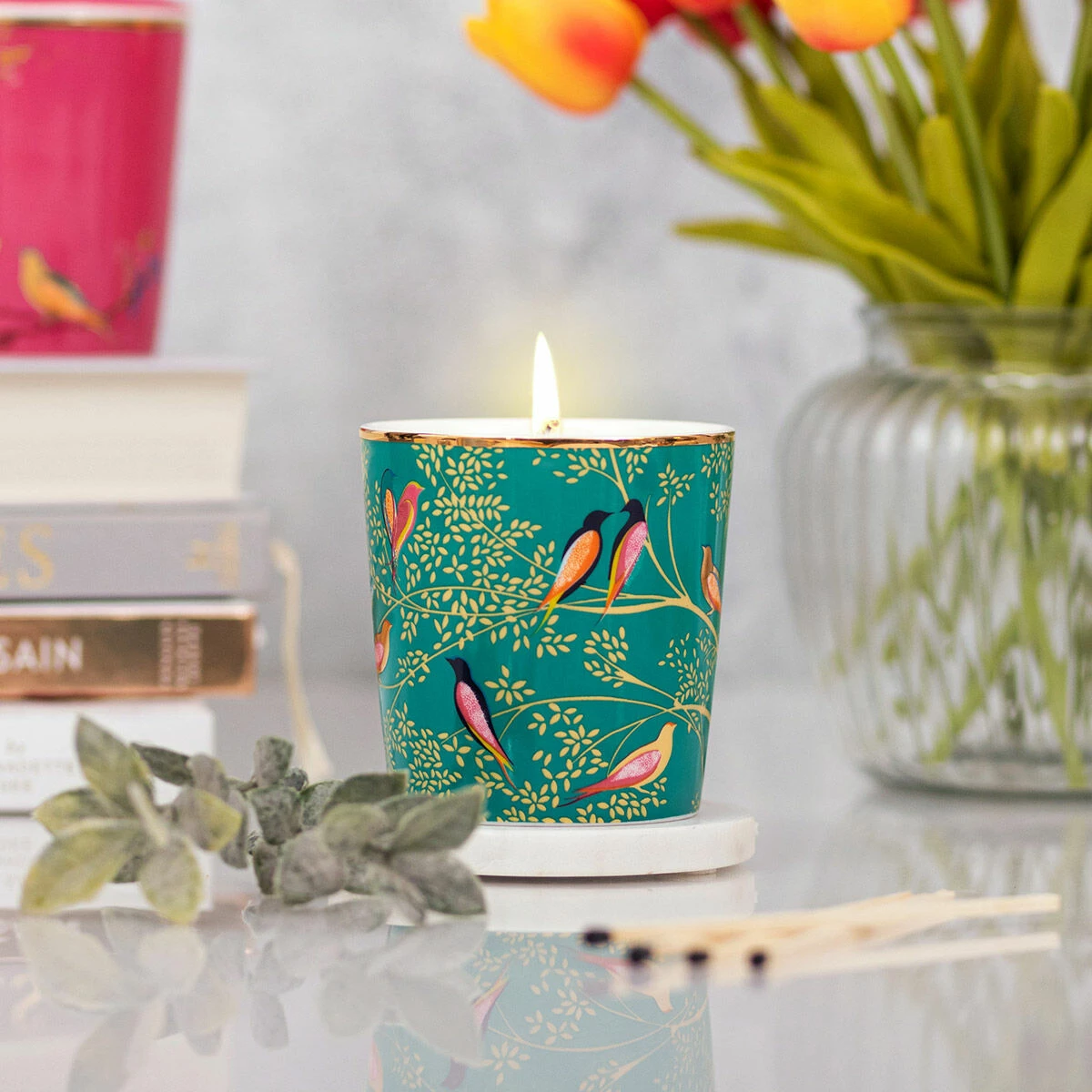 The beautiful fragranced coconut wax candle comes in a ceramic jar which features an exquisite Chelsea design from Sara Miller; colourful lovebirds sit amongst tree branches, each branch is adorned with golden foliage set against a vibrant green background. The sleek jar vessel is finished with 22 carat gold details including a circle around the rim and is topped with a lid featuring a golden knob and foliage which matches the design around the edge of the vessel completing the sophisticated piece of home decor.