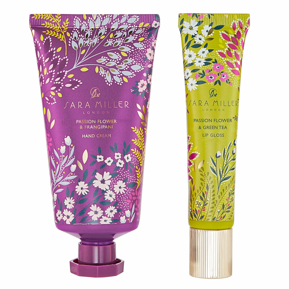 Indulge your skin with the scents of passion flower and frangipani for a fresh and floral scent while the delightful combination of passion flower and coconut oil glides across your lips for a bright and moisturised finish. The tube of hand cream is decorated with Sara Miller’s Haveli Garden design of foliage and florals set against a purple background. The Haveli Garden design continues across the lip gloss set against a lime green background.
