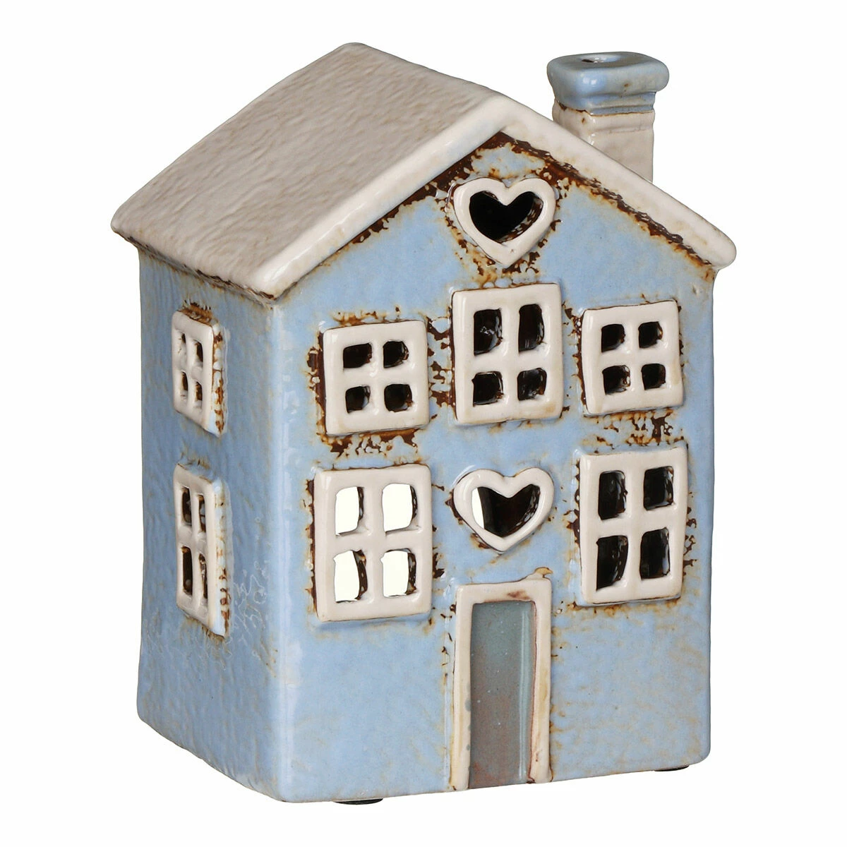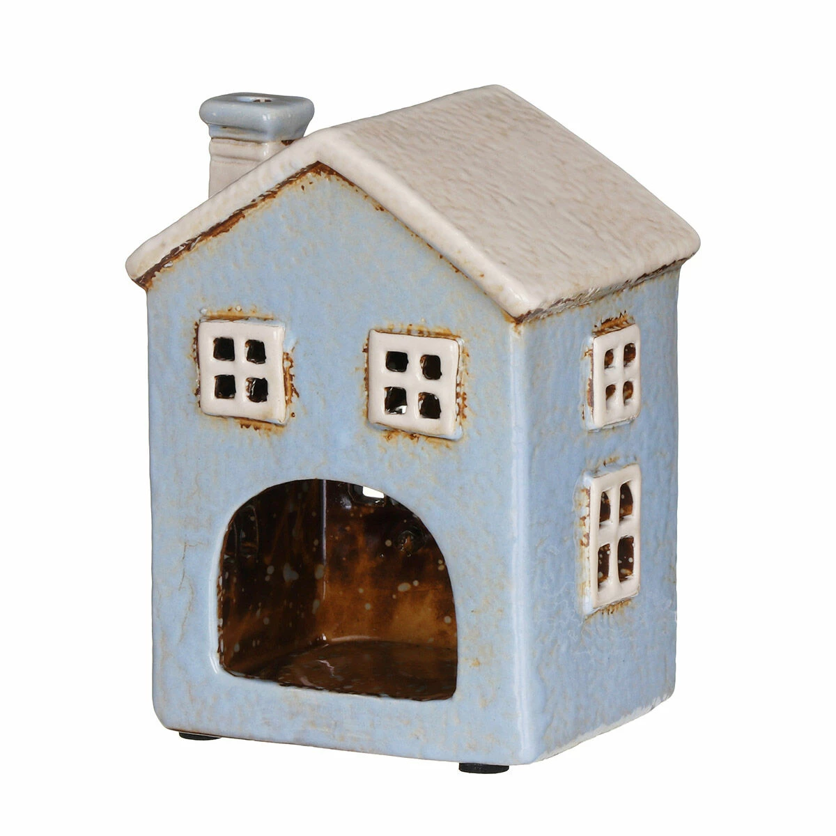 Featuring a rustic house with a blue and cream glaze, this dainty tealight holder will look lovely when displayed on a shelf or windowsill. Place a tealight of your choice inside the rear of the house and watch the glow from the flame light up behind the windows of the house.