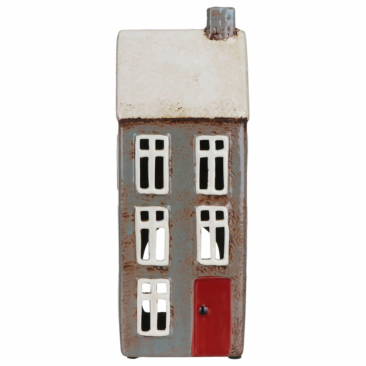Featuring a tall house with a dark grey and cream glaze, this charming tealight holder will look lovely when displayed on a shelf or windowsill. Place a tealight of your choice inside the rear of the house and watch the glow from the flame light up behind the windows of the house.