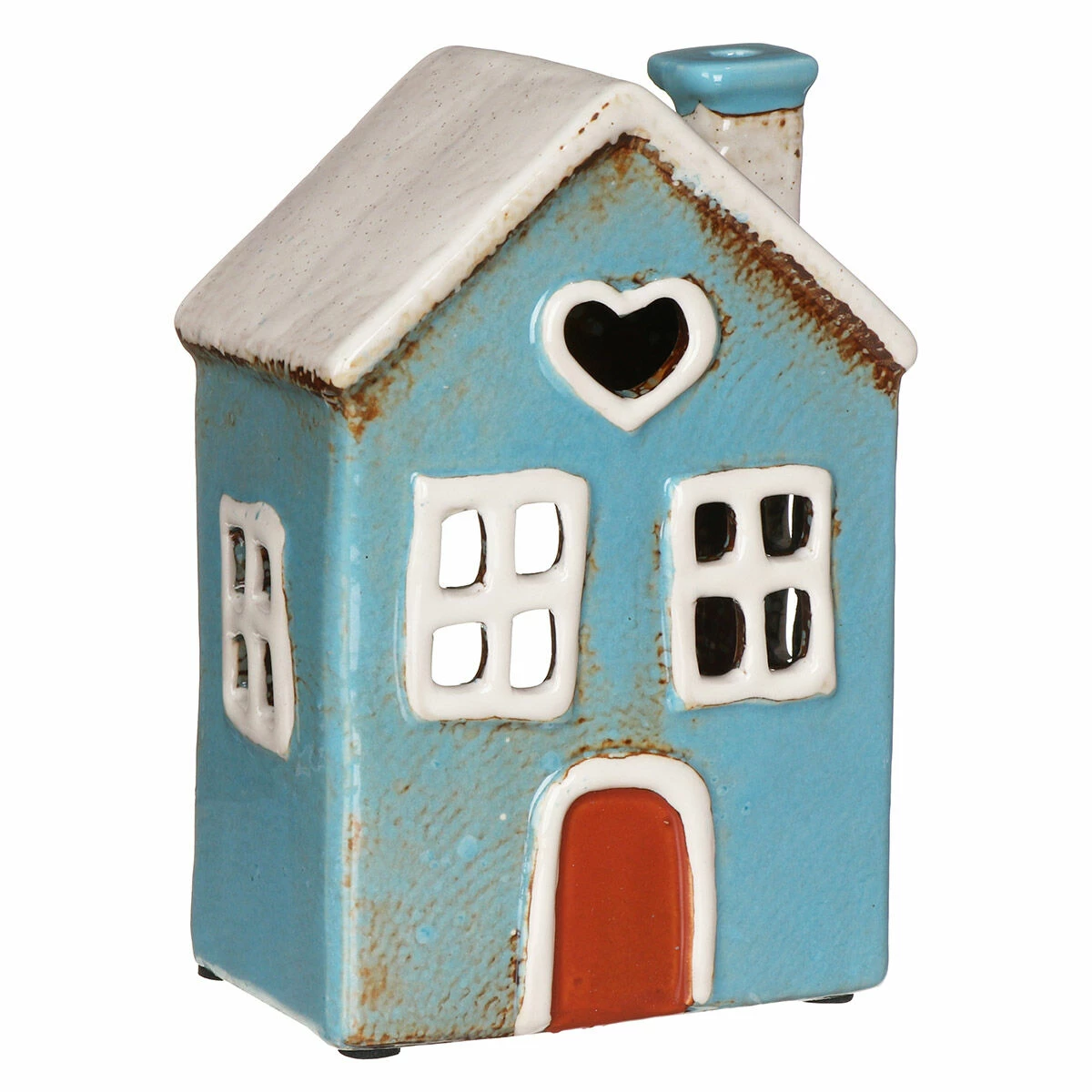 Featuring a rustic house with a teal and cream glaze, this dainty tealight holder will look lovely when displayed on a shelf or windowsill. Place a tealight of your choice inside the rear of the house and watch the glow from the flame light up behind the windows of the house.