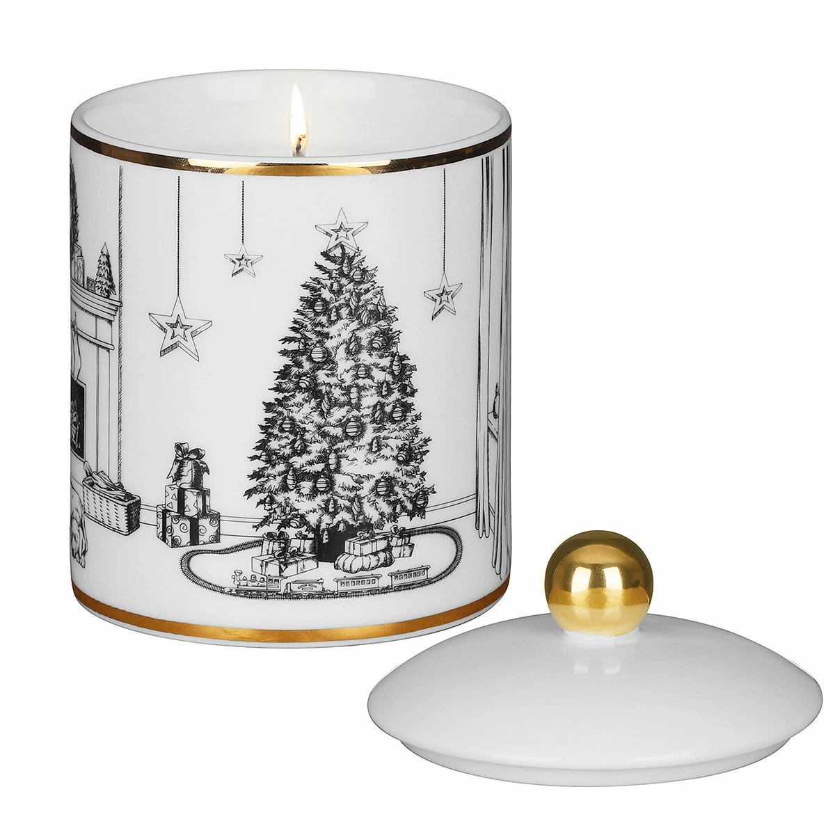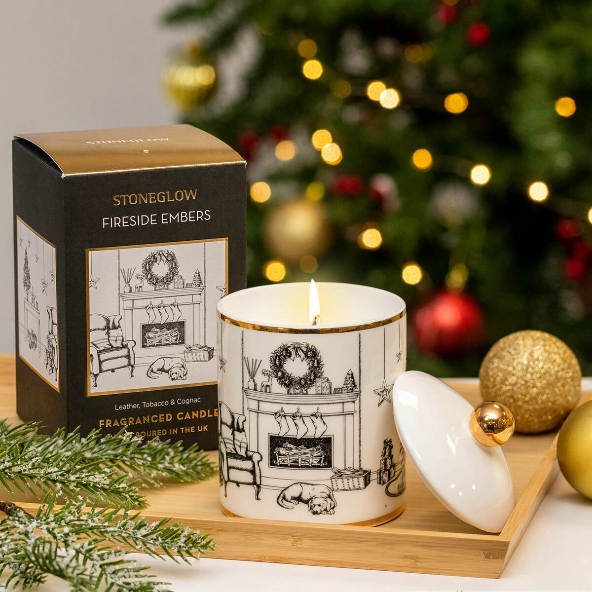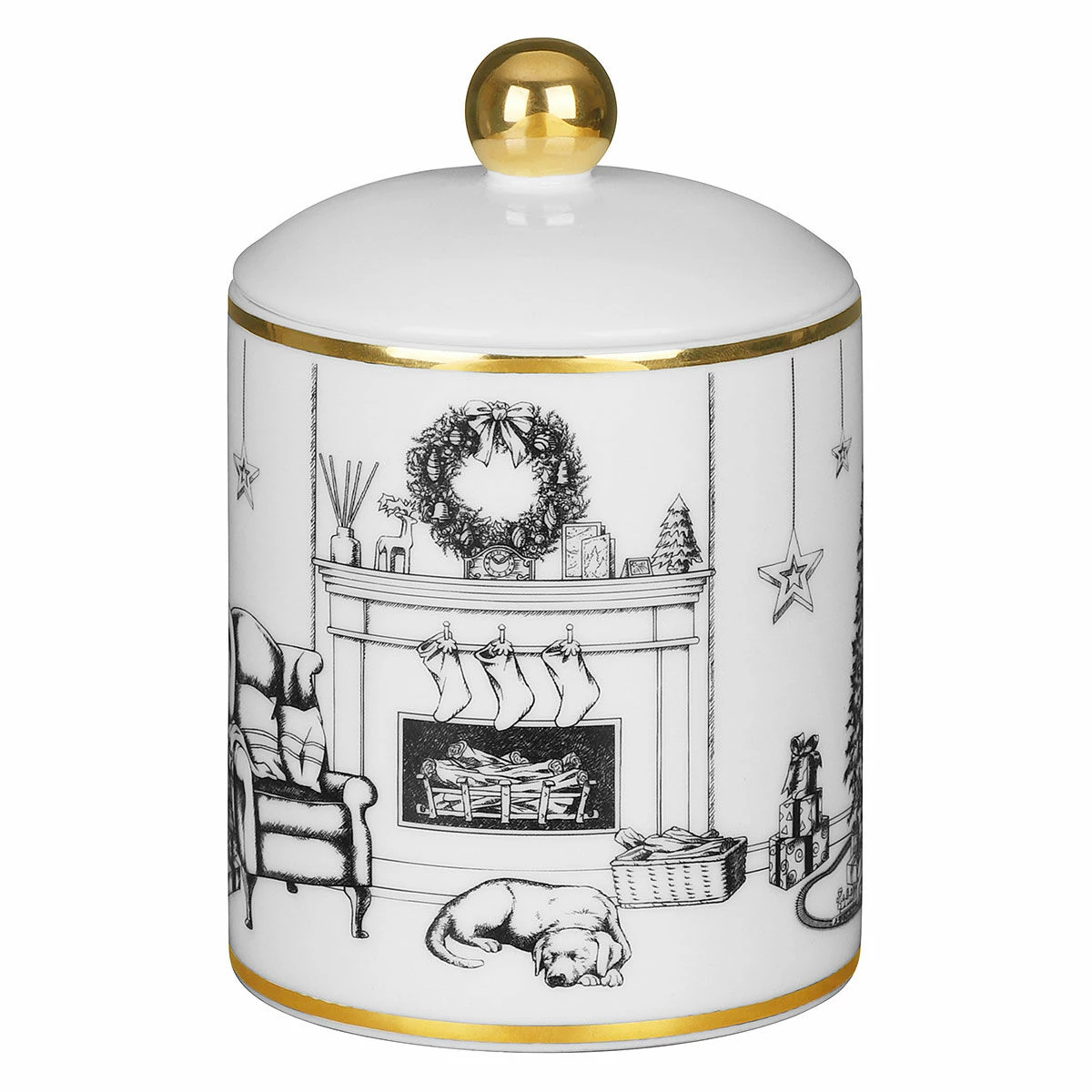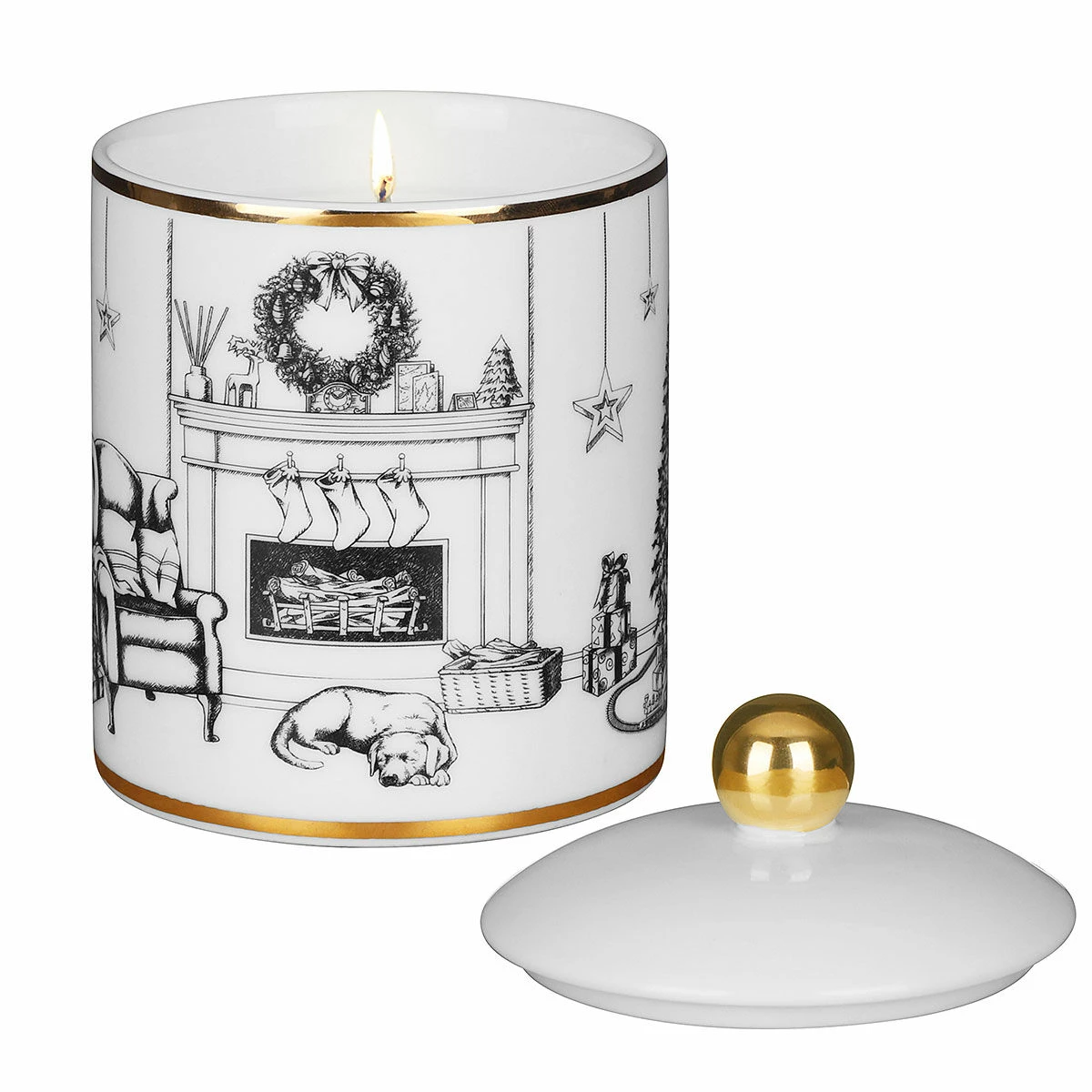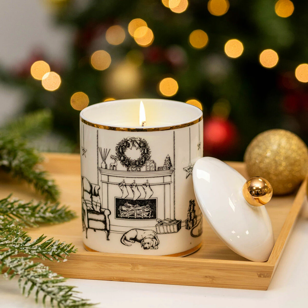 The sleek white jar is beautifully illustrated with an ornate Christmas scene of a Labrador curled up next to an open fire, with a Christmas tree, presents and other decorations around the room. The jar is prefilled with 250g of fragranced pure soy wax. Packaged in a matching gift box with gold detailing, this item makes a lovely Christmas or birthday gift for friends and family.