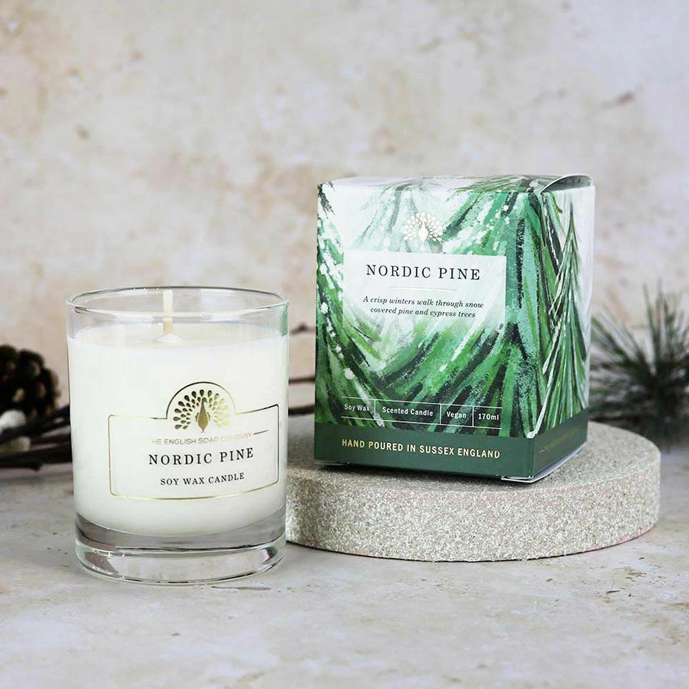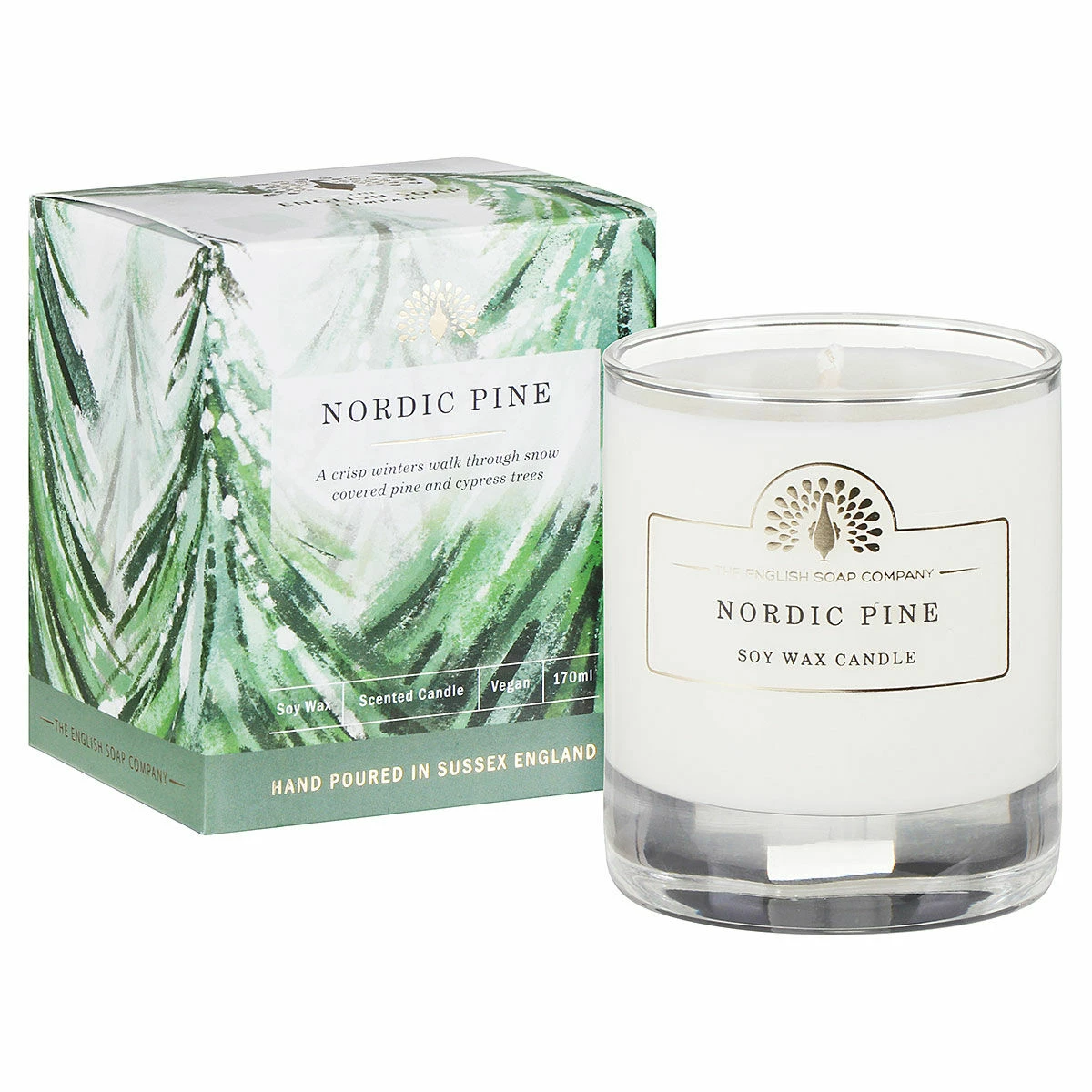 Feeling festive? Fill your home with the wonderful aromas of this Nordic Pine soy wax candle from the Wintertide collection by The English Soap Company. A magnificent concoction of aromas, this fragrance is reminiscent of a crisp winter walk through snow-covered pine and cypress trees.