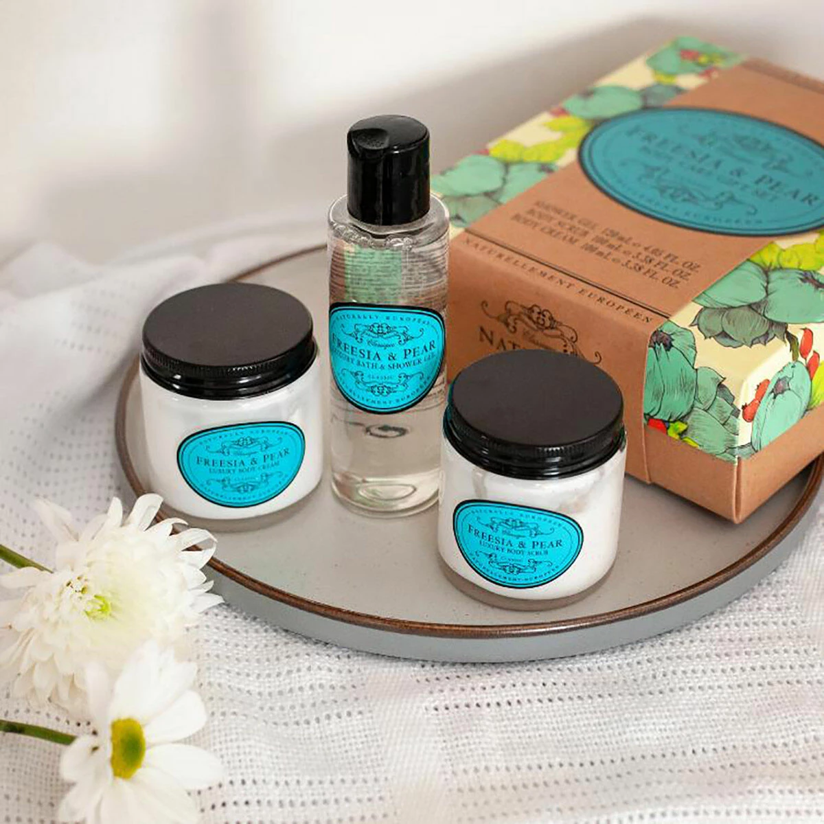 Cleanse your body using this fabulous body care gift set, a part of the Naturally European range from The Somerset Toiletries Company. These luxury toiletries will emit the delicate aroma of freesia and pear which will surround you as you cleanse and nourish your skin.
