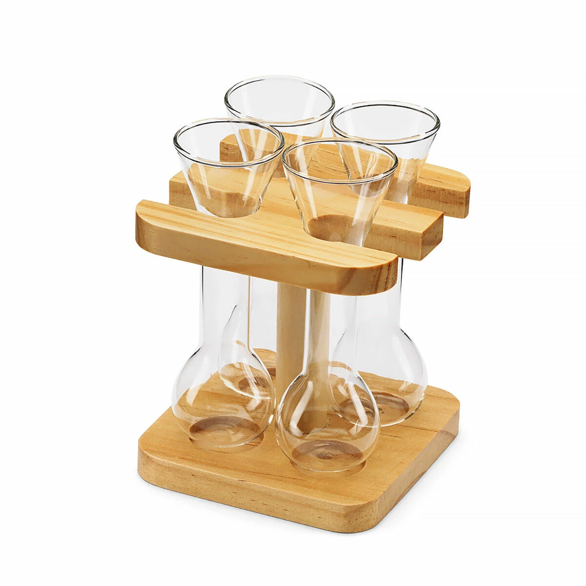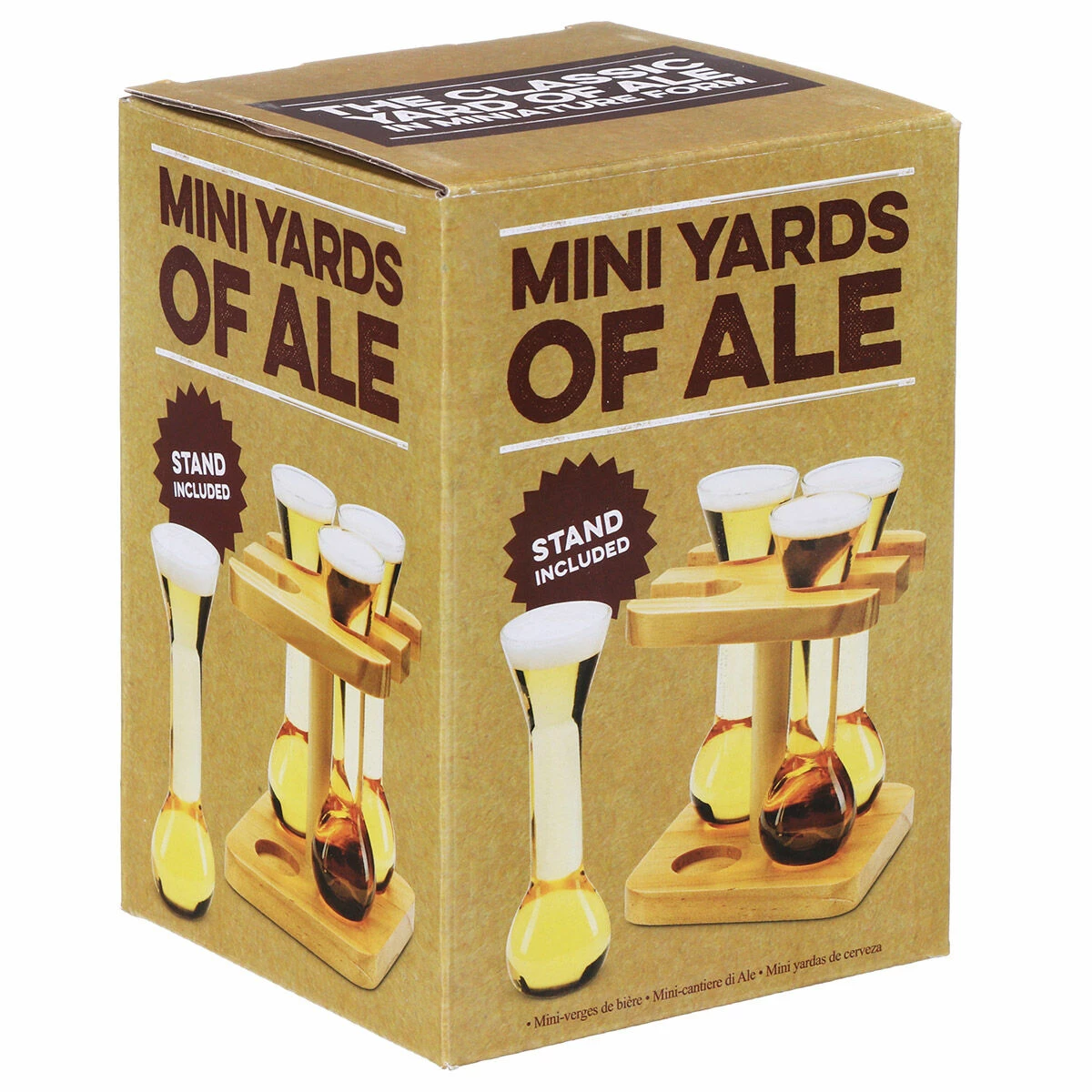 Set includes: 4x 55ml Mini Yard of Ale Glasses, 1x Wooden Stand.