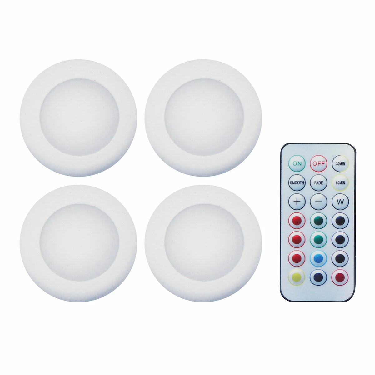 Set includes: 4x Mood Lights, 4x Self Adhesive Pads, 1x Remote Control
