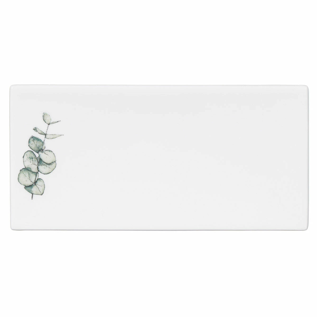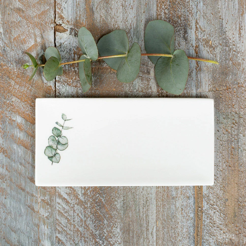 The lefthand side of the soap dish features a dainty watercolour illustration of a stem of eucalyptus leaves that stands out beautifully against a crisp white background. The superb print quality captures the fine detail and vibrant colours of each hand-drawn design.