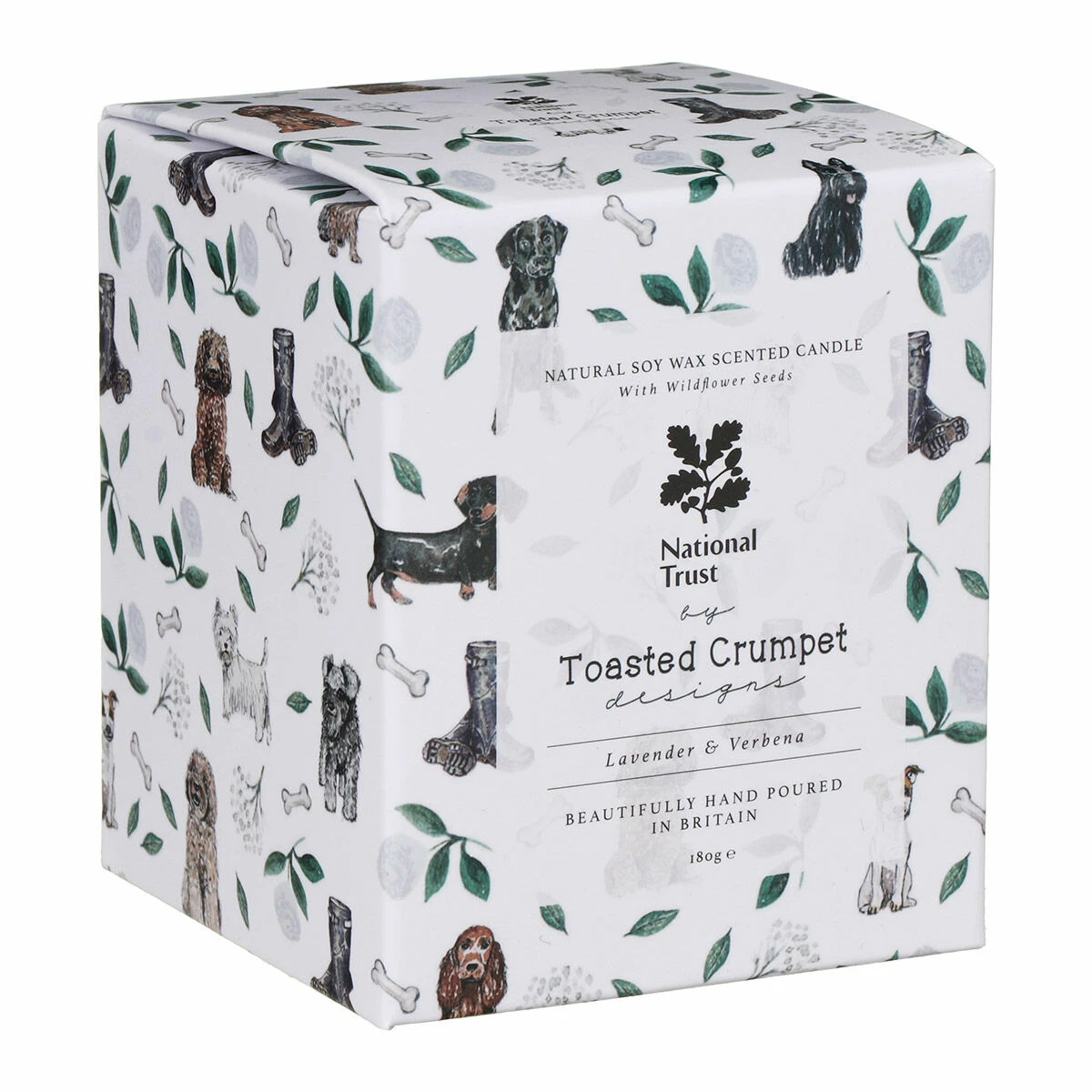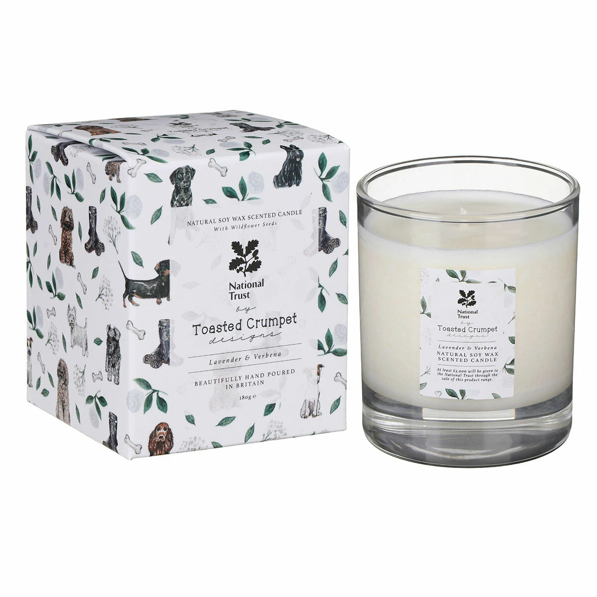 Presented in a transparent glass jar featuring a label decorated with an assortment of adorable dog breeds, wellies and leaves, the candle is made from 100% natural vegetable soy wax that is hand-poured in Britain.