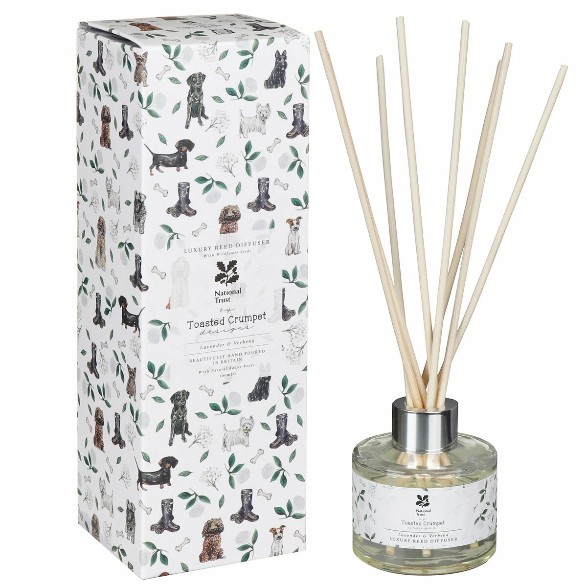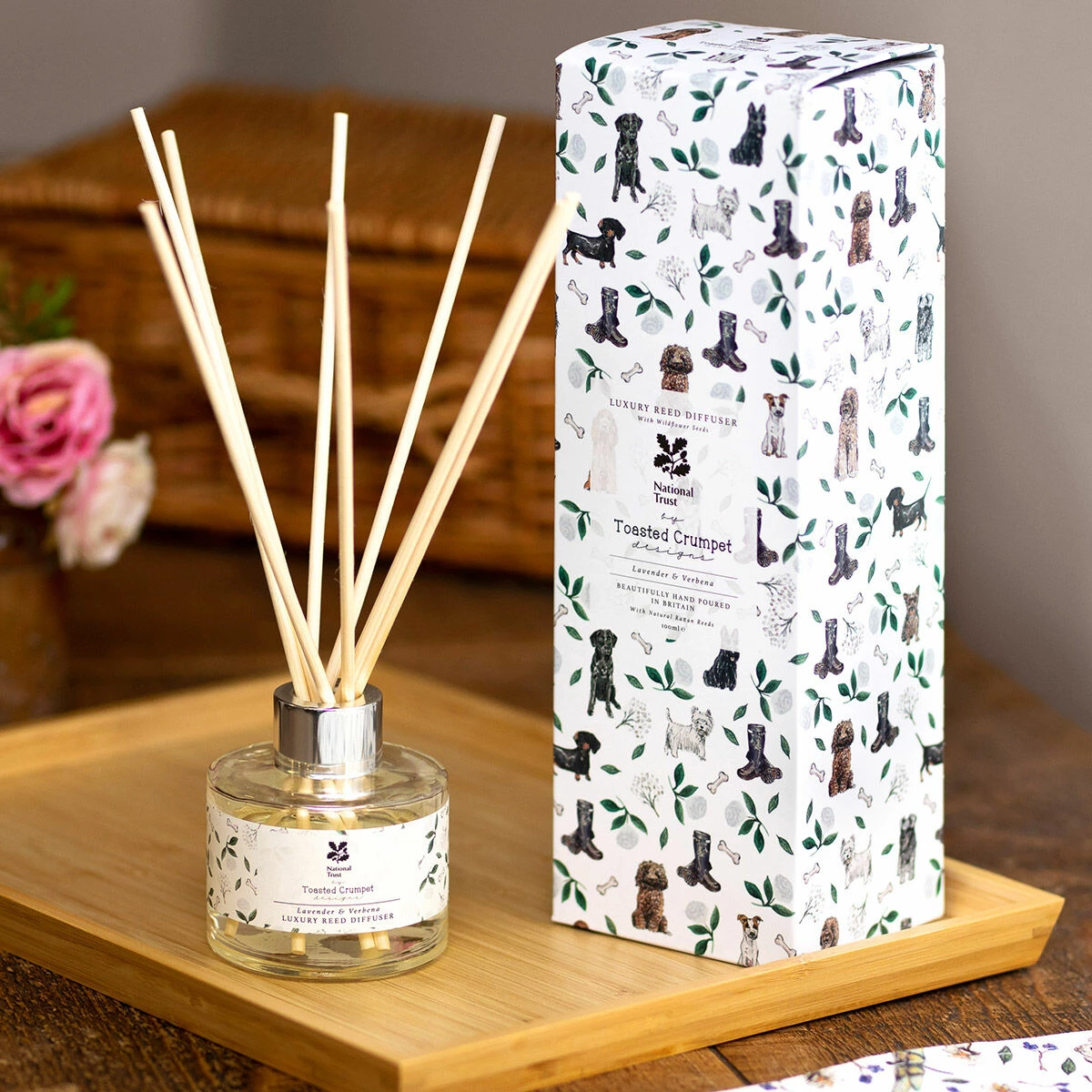 Presented in a transparent glass jar featuring a label decorated with an assortment of adorable dog breeds, wellies and leaves, the diffuser features 100% natural sustainable rattan reeds that gently diffuses the gorgeous scent.