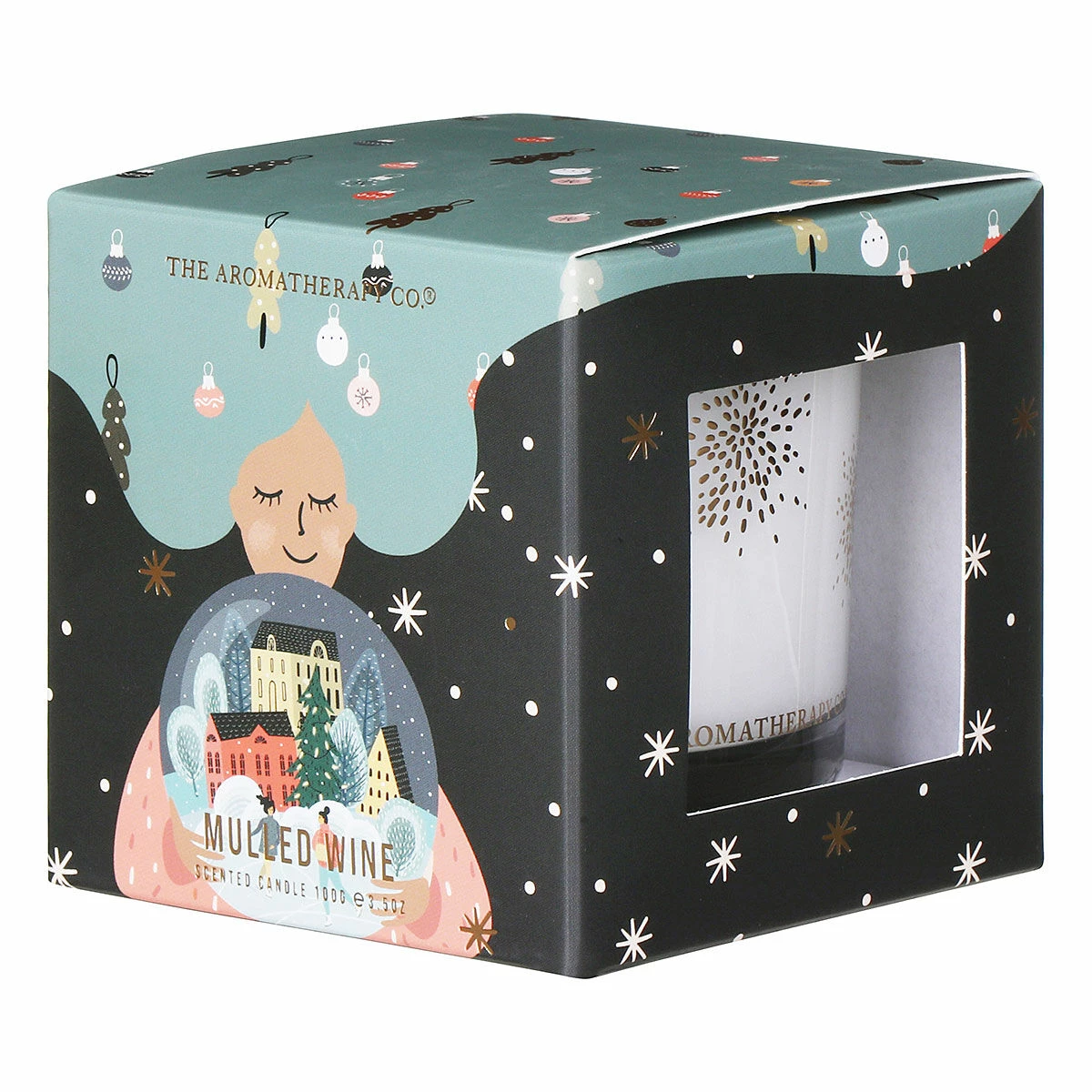 This is a beautiful candle presented in a navy festive box with a lady with flowing green hair filled with festive decorations whilst she’s holding a large glass snow globe with shimmering golden accents. It makes the perfect gift for any loved one this Christmastime.