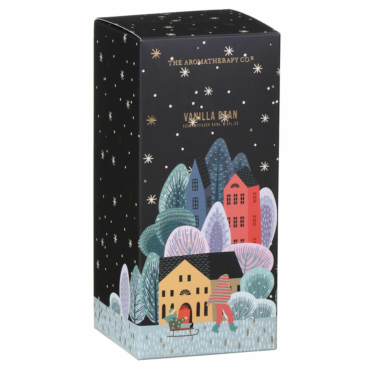 This is a beautiful reed diffuser presented in a brown festive box with a festive village scene with golden twinkling stars.