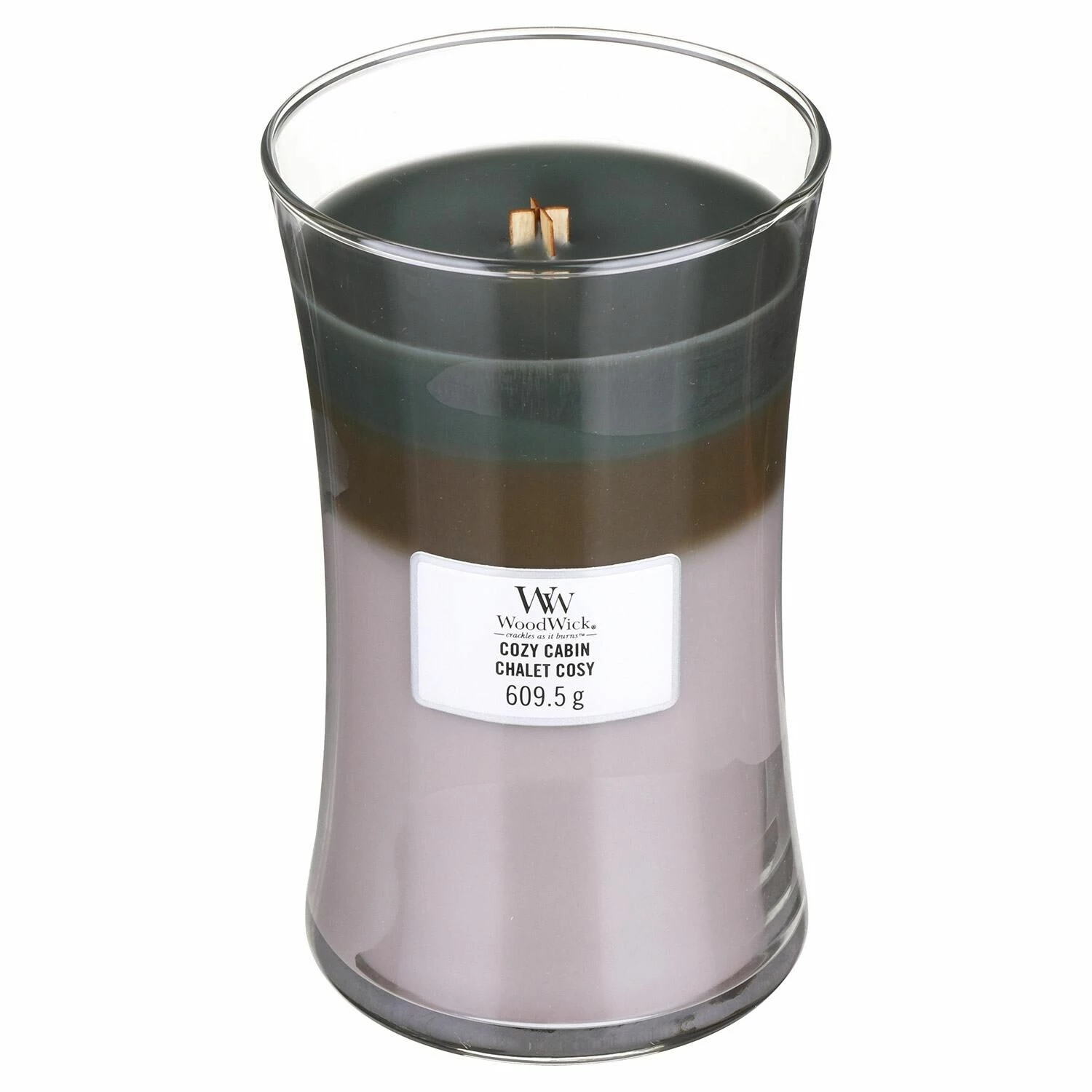 Fill your home with the warming scent of Cozy Cabin with this stunning candle from the Trilogy range by WoodWick. The candle features three layers; each individually scented and creating a completely unique aroma as the candle burns. Complementing the bold scent is the distinctive shape of the candle holder which gently flares at the base and the rim and is made of sturdy glass.